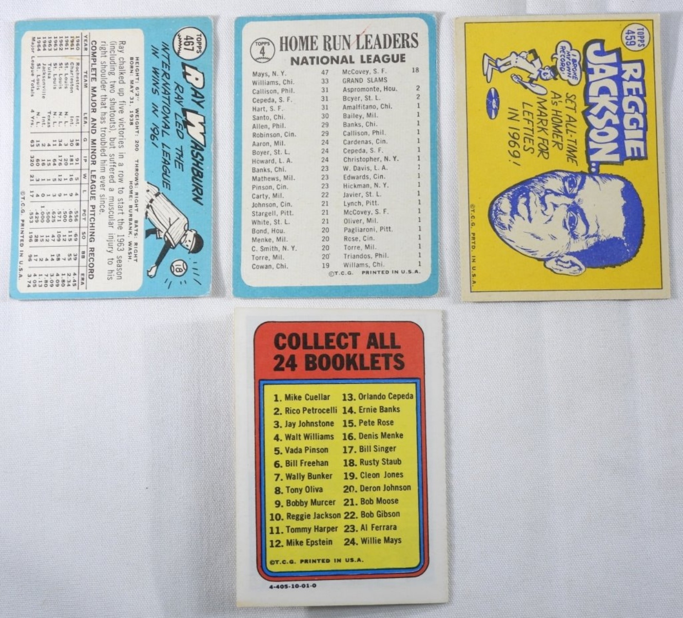 1) The Reggie Jackson Story Booklet Number 10 VG. 2) 1964 Home Run Leaders Number 4 G/VG. 3) Reggie Jackson Number 459 VG