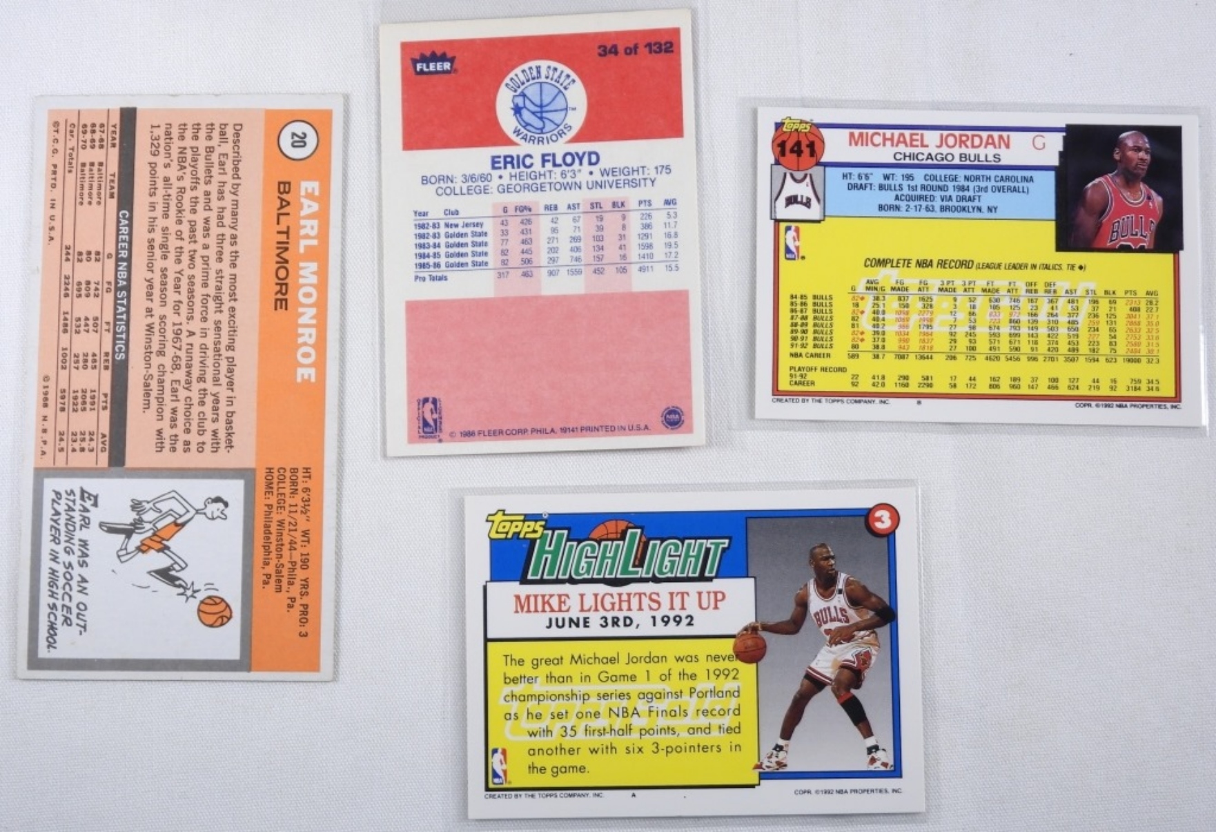 1) Eric Floyd Fleer Number 34 VG. 2) Michael Jordan TOPPS Number 141 VG. 3) Highlight Michael Jordan TOPPS Number 3 VG. 4) Earl Monroe TOPPS Number 20