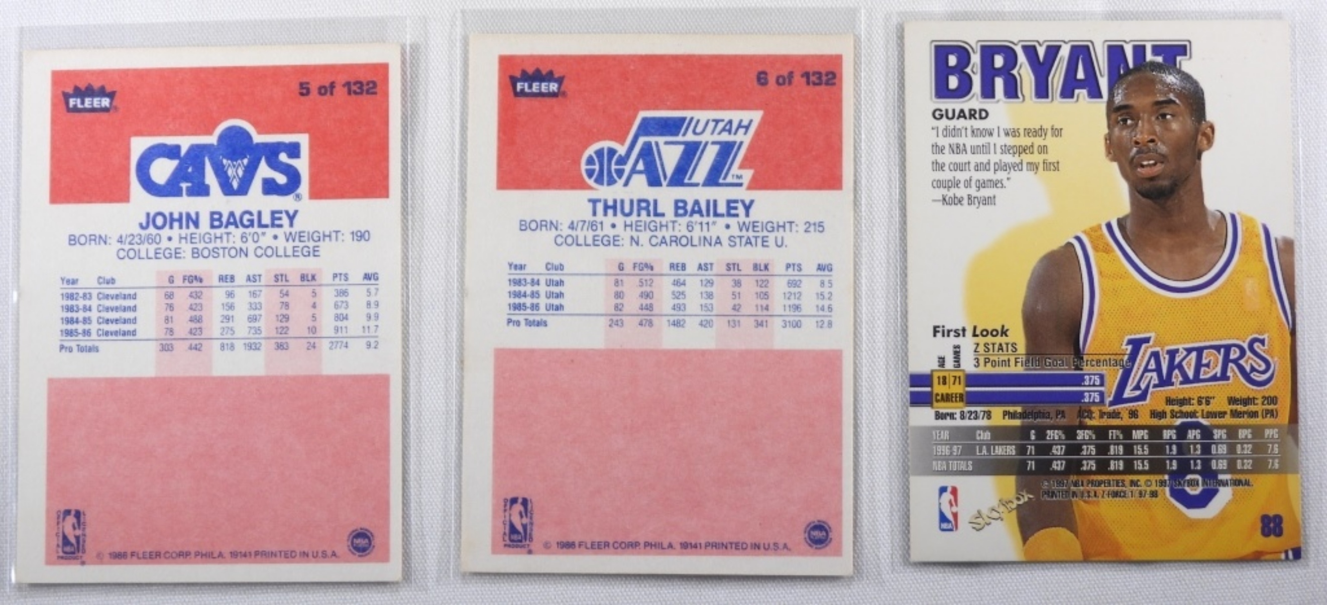1) Thurl Bailey Fleer #6 VG. 2) John Bagley Fleer #5 VG. 3) Kobe Bryant # 88 VG