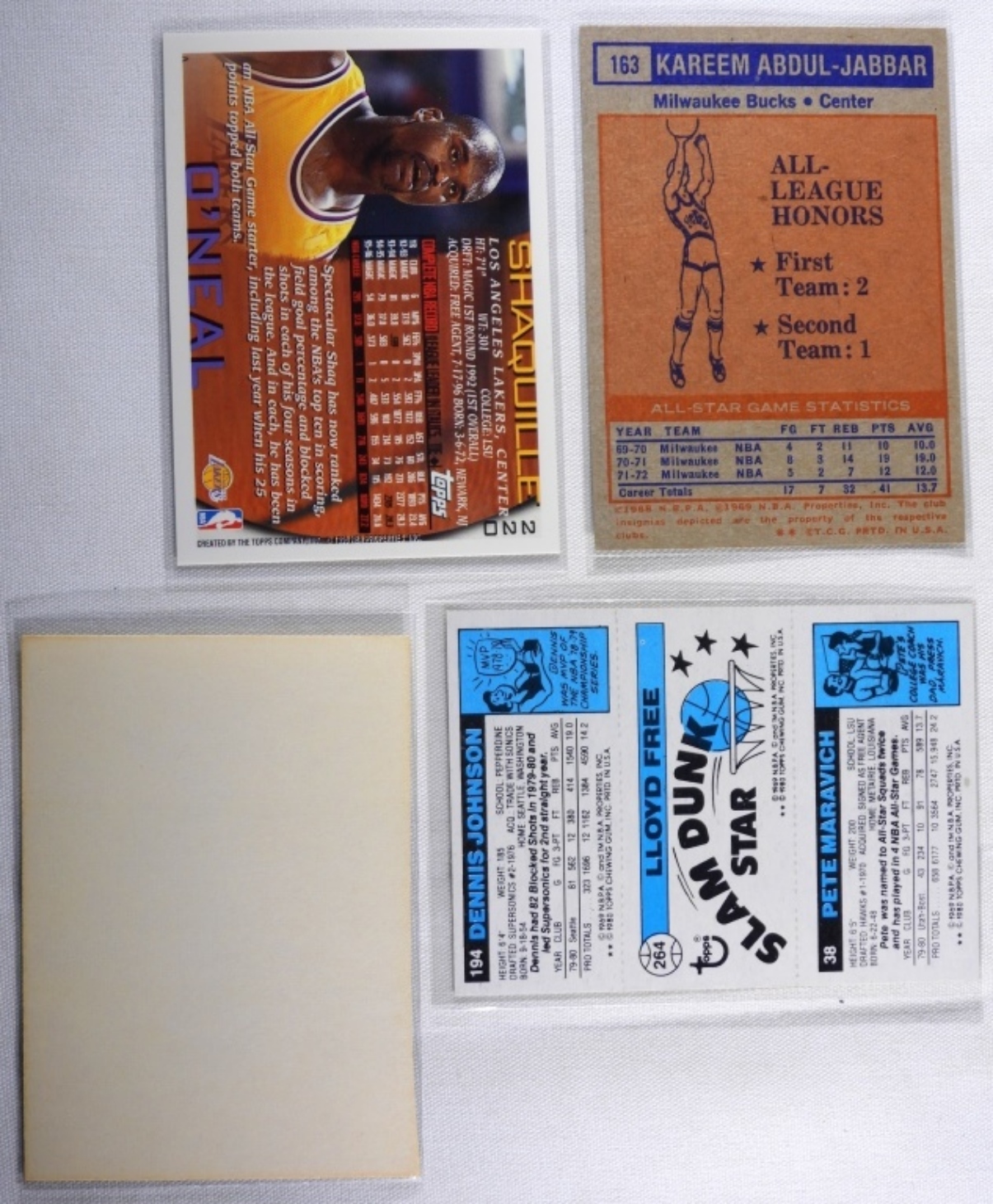 1) Willis Reed #32/ Chet Walker #33 VG. 2) Pete Maravich #38/ Lloyd Free #264/ Dennis Johnson #194 VG. 3) Kareem Abdul-Jabbar #163 VG. 4) Shaquille O’Neal #220 VG