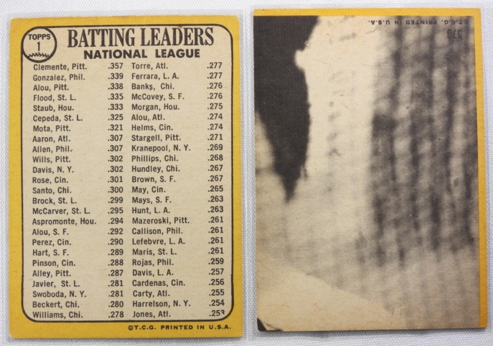 1) 1967 Batting Leaders TOPPS number 1 VG. 2) The Sporting News All Stars Selection TOPPS number 370 VG.