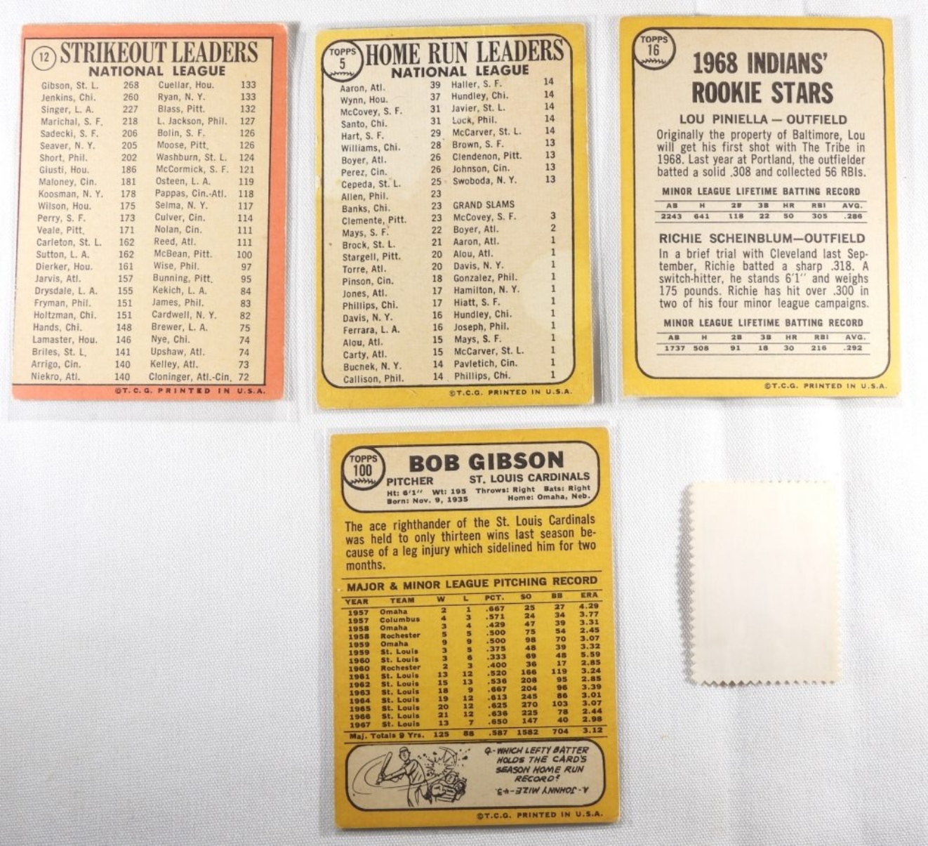 1) VG Ernie Banks Stamp. 2) 1968 Strikeout Leaders National League TOPPS Number 12 VG. 3) 1968 Rookie Stars TOPPS Number 16 VG. 4) 1967 Home Run Leaders TOPPS Number 5 VG. 5) Bob Gibson TOPPS Number 100 VG.