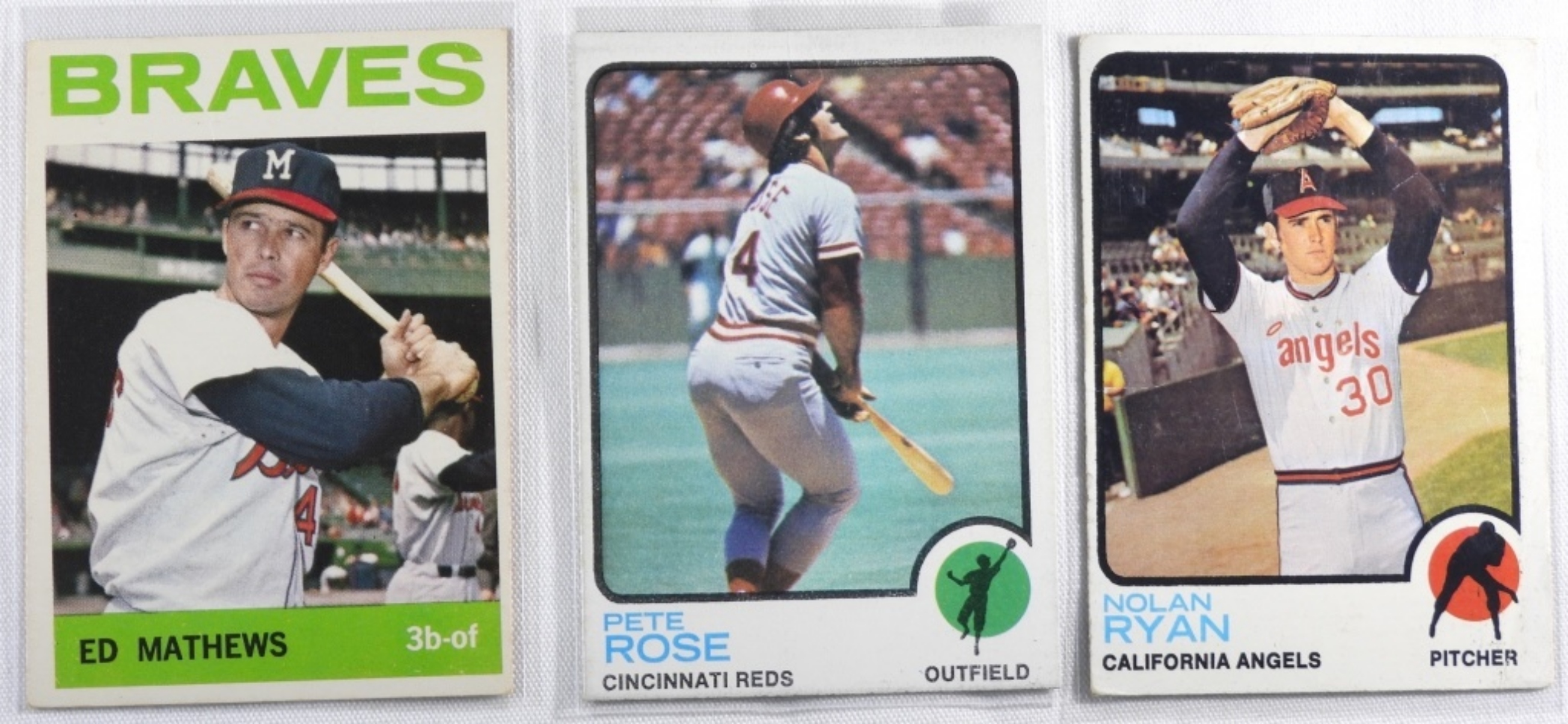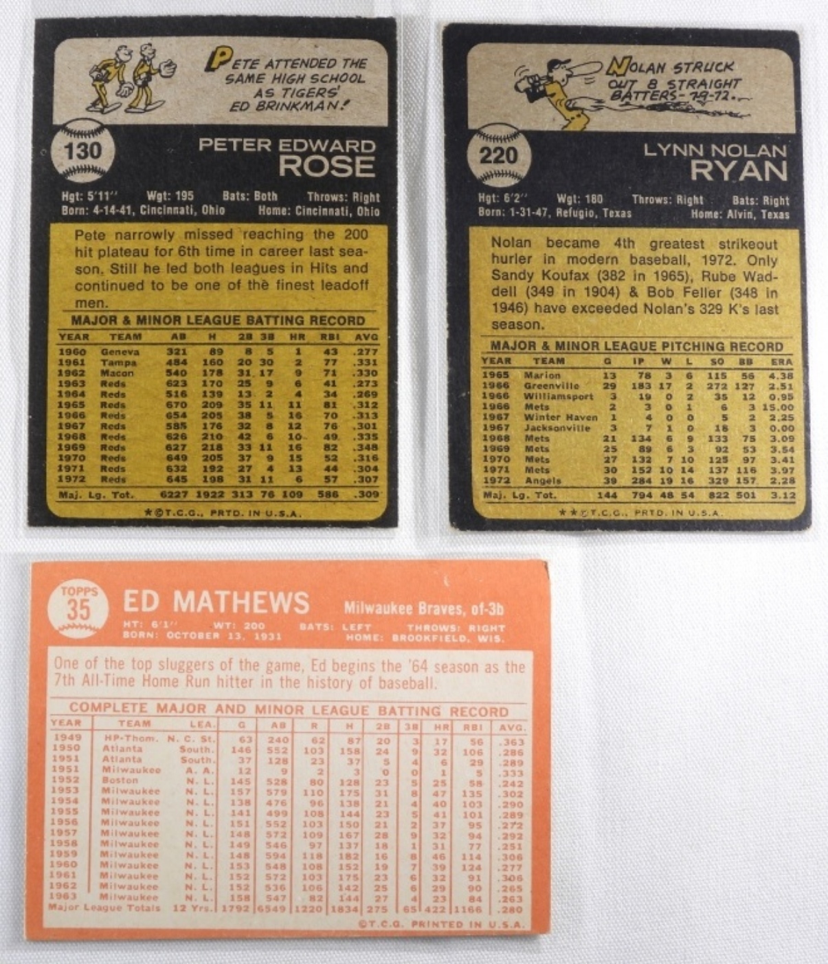 1) Ed Mathews Number 35 VG. 2) Nolan Ryan Number 220 VG. 3) Pete Rose Number 130 VG.