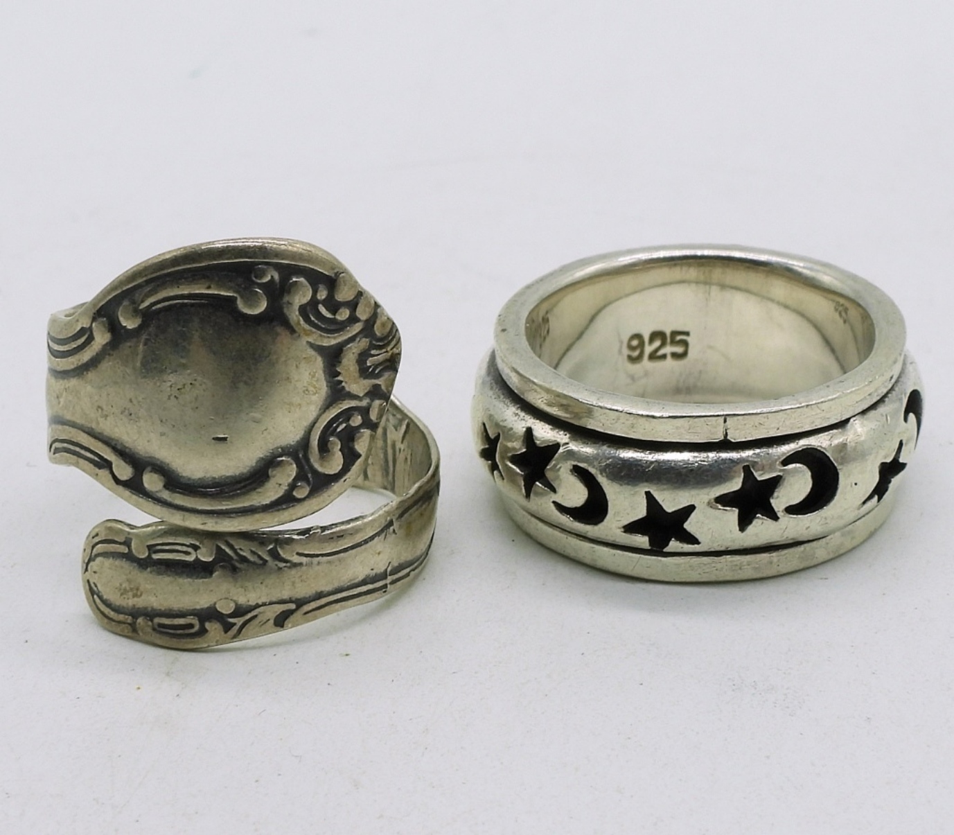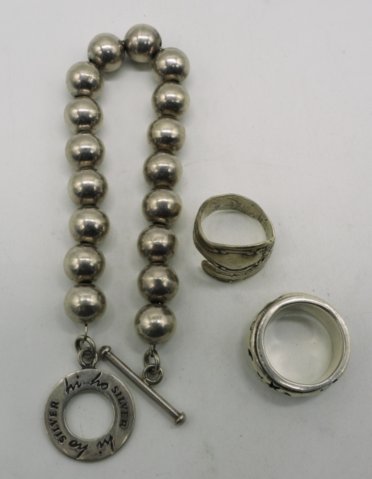 Sterling beaded bracelet, 8″ long. Marked “hi ho silver”. Two sterling rings, sizes 7 & 7.5. Star and moon ring is a fidget ring. (29.4 dwt) (6x4x2)
