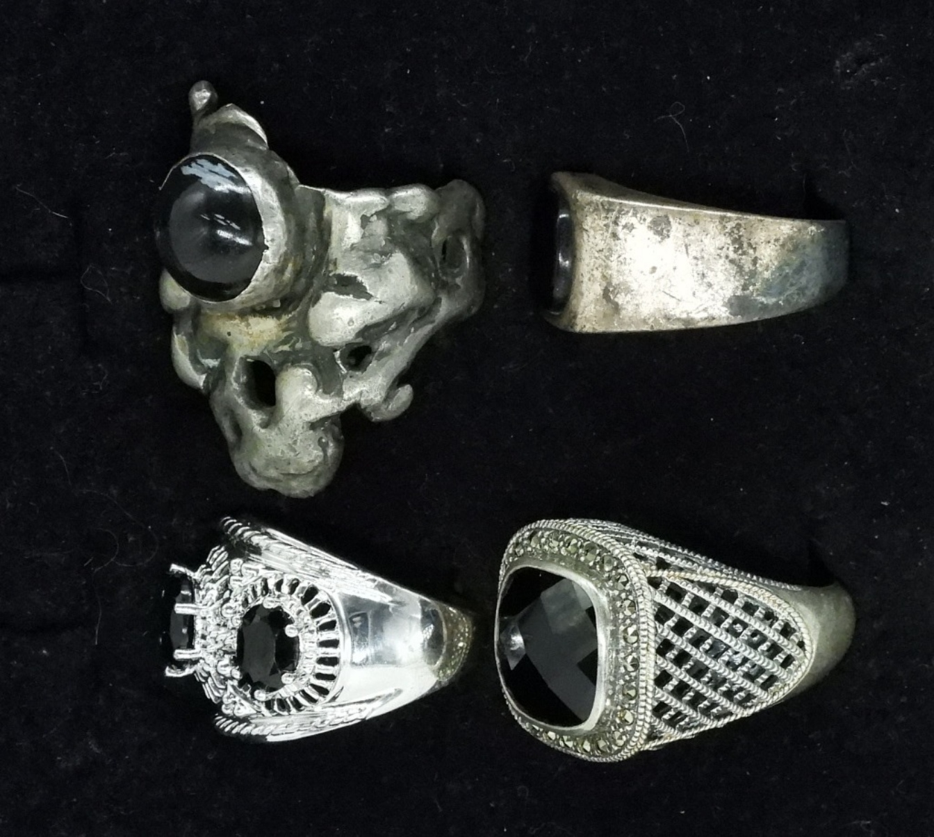 Four sterling rings with black onyx gemstones. Sizes 6-10 (32 dwt) (6x4x2)
