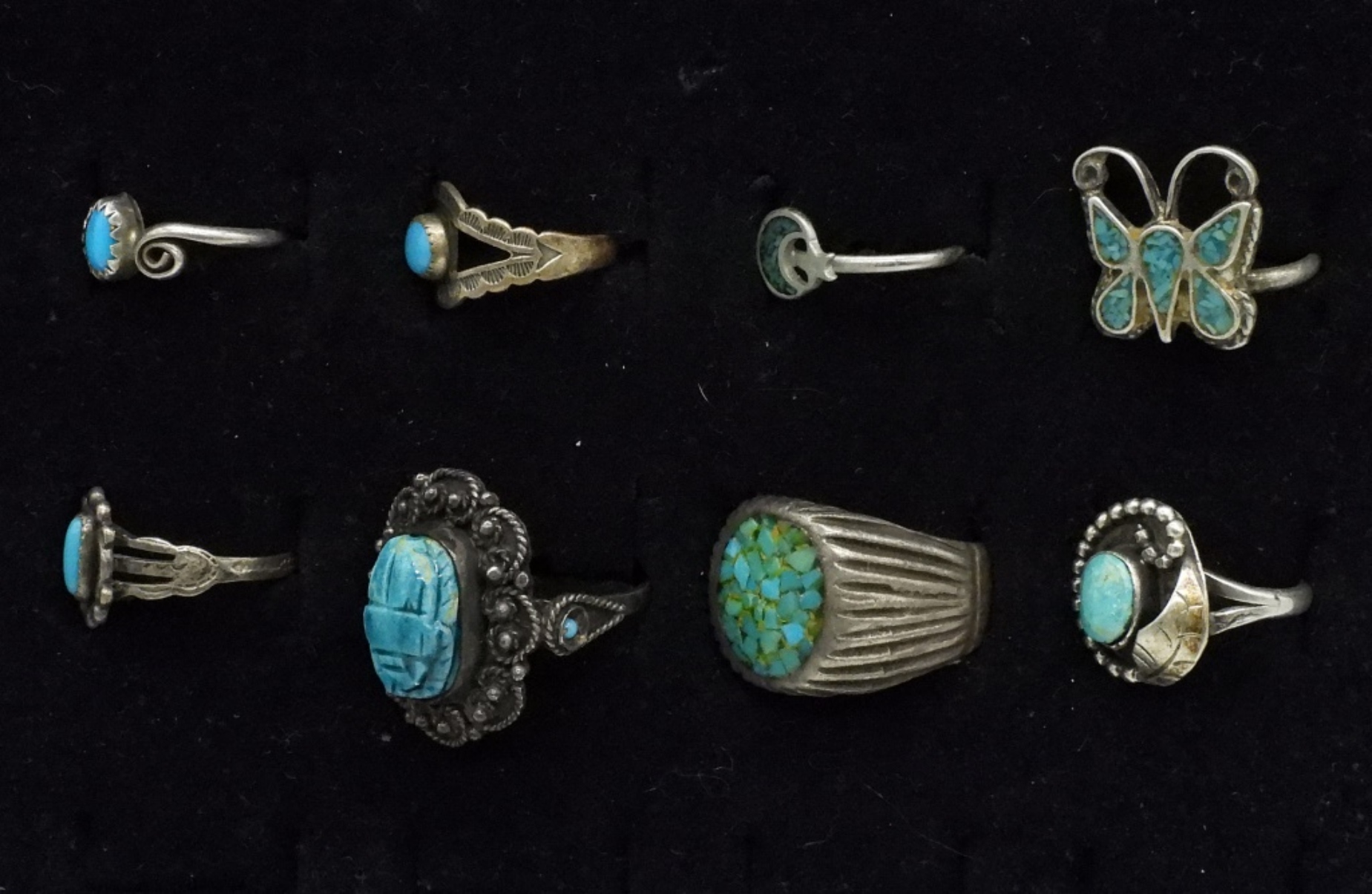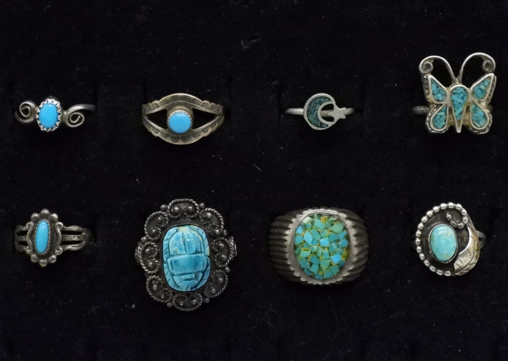 Eight vintage sterling rings with turquoise gemstones and inlays. One ring, the band has been cut! Sizes 4-8 (20 dwt) (6x4x2)
