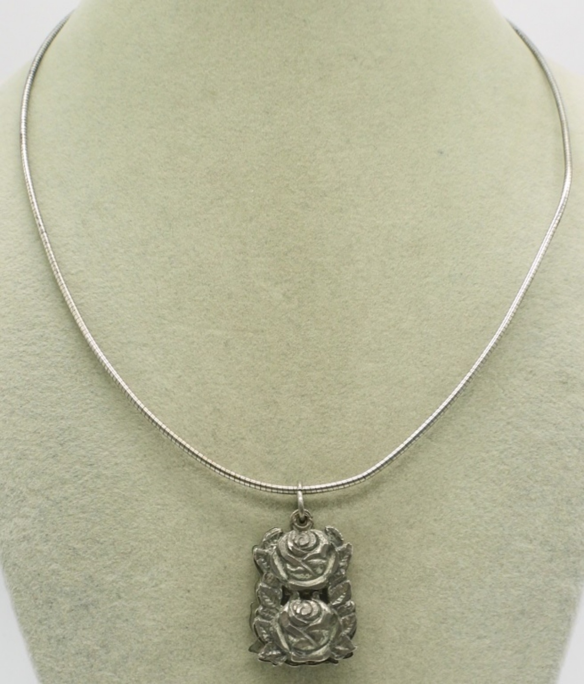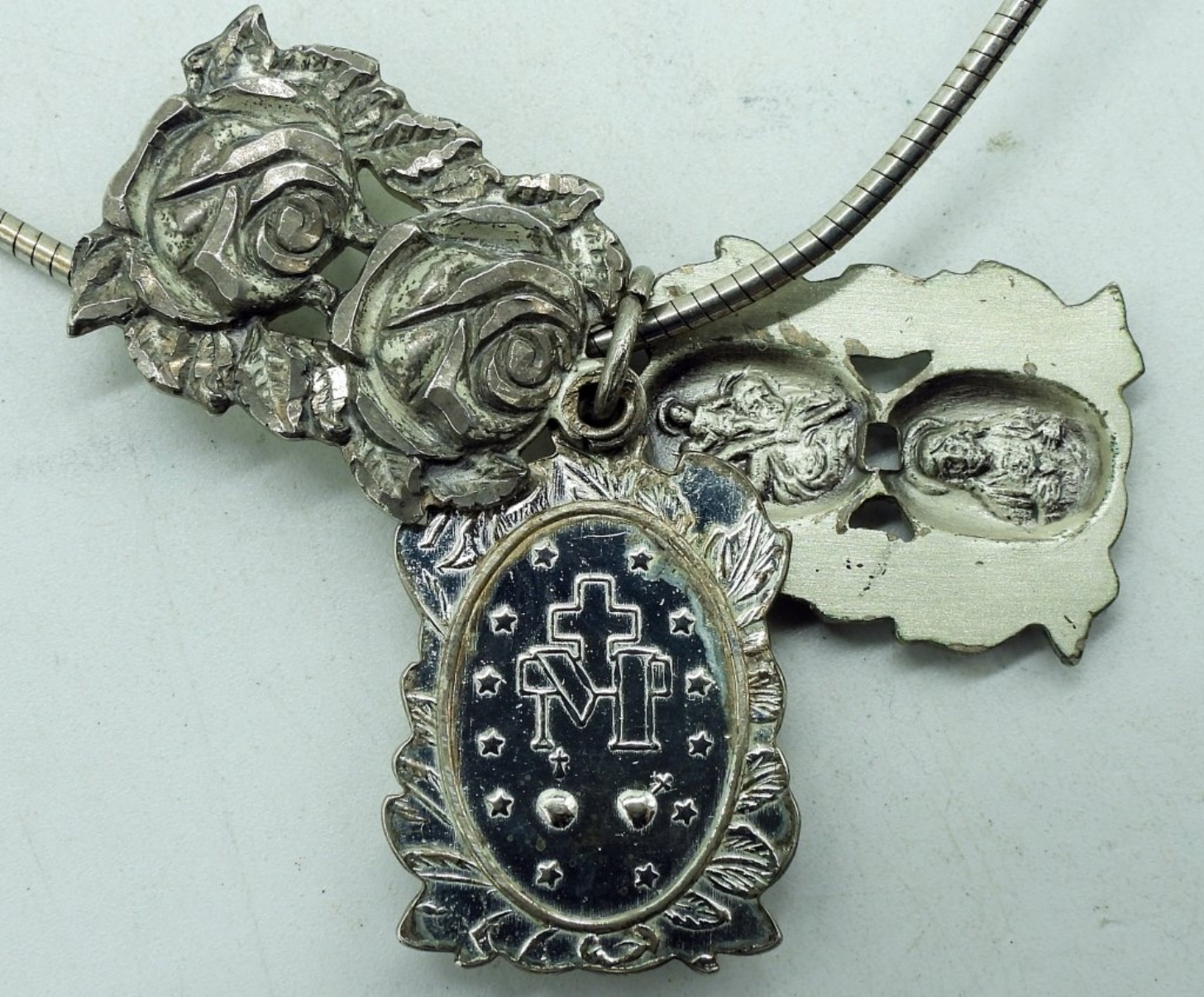 Religious rose, sterling necklace. Pendant is three pieces. Chain is 18″. (12.6 dwt) (6x4x2)
