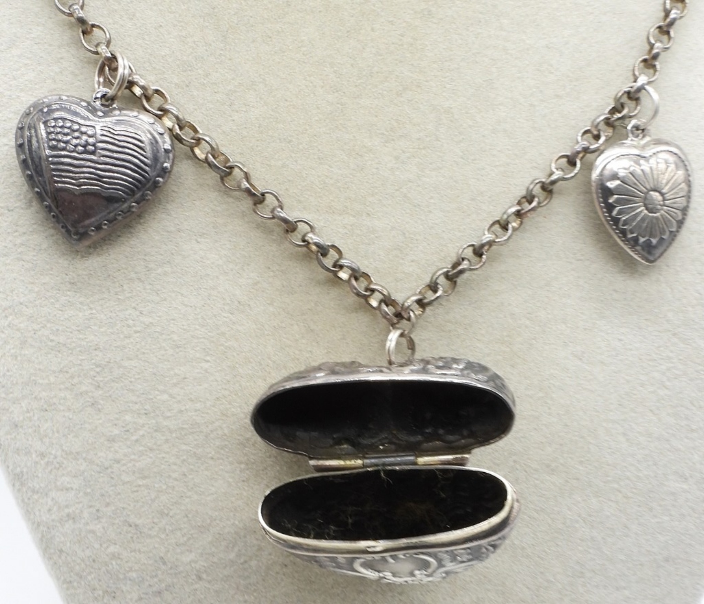 Sterling heart perfume locket necklace, 30″ long. Still smells of the perfume. (25.6 dwt) (6x4x2)