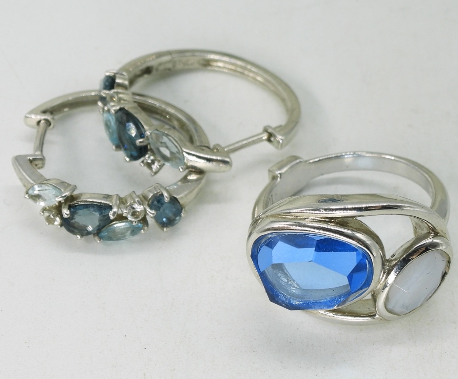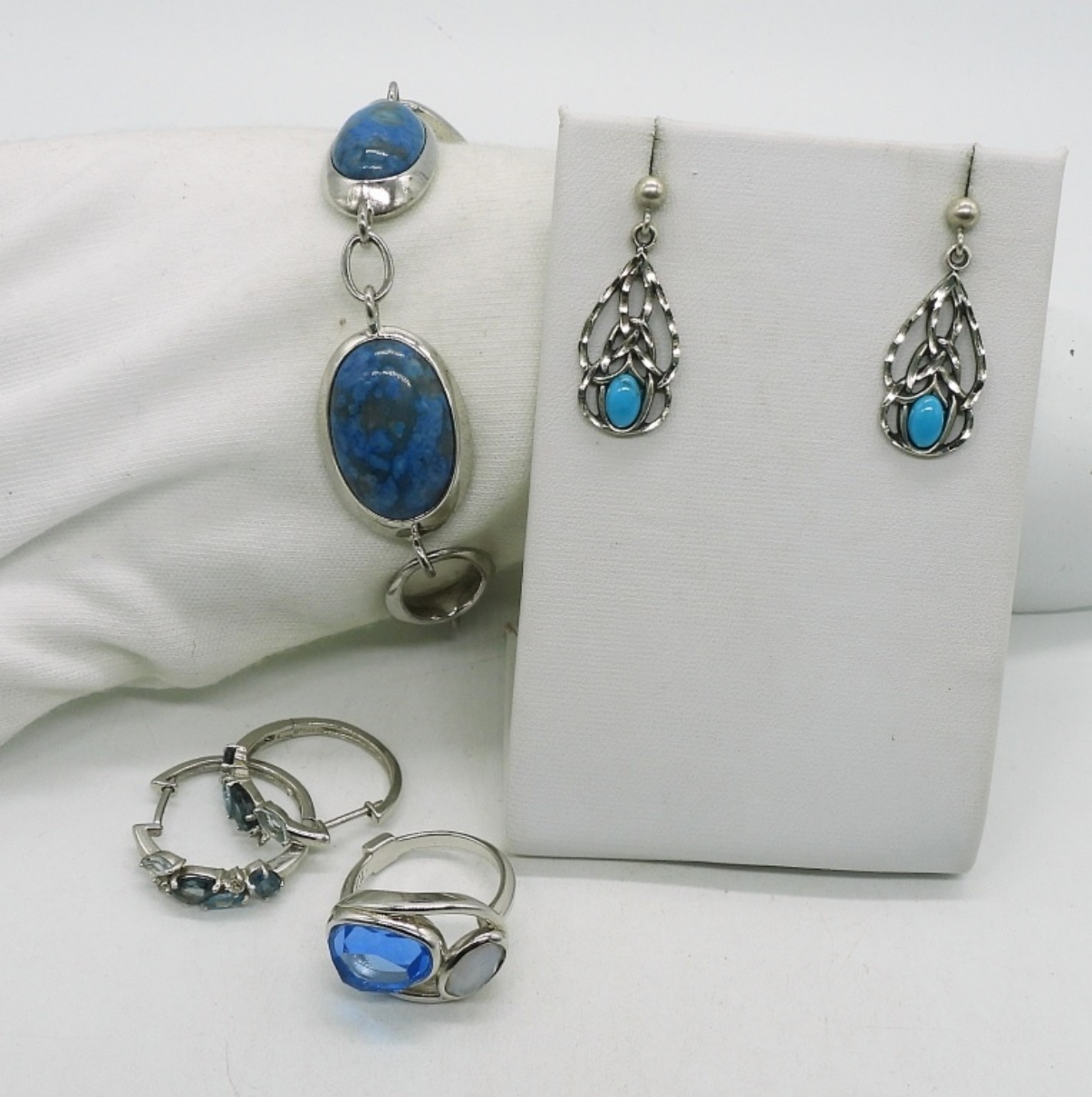 Turquoise gemstone, sterling toggle bracelet. 7.5″. Two pair of pierced earrings, both 1″ long. Ring size 7. (24.8 dwt) (6x4x2)