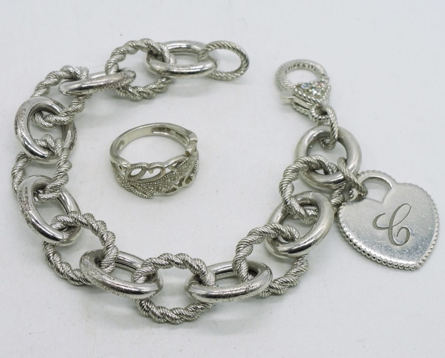 Chunky sterling bracelet with heart pendant, engraved with a C. 8″ long. Sterling ring, size 6 (31.8 dwt) (6x4x2)