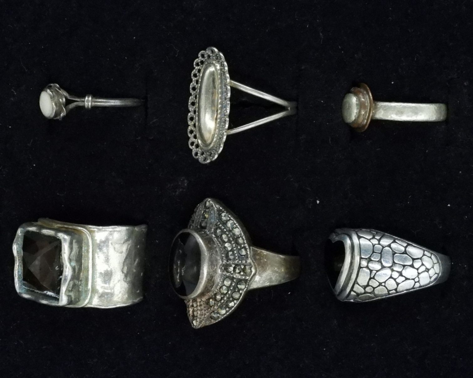 Six sterling rings with black onyx, mother of pearl and smokey quartz gemstones. Sizes 4-8 (22 dwt) (6x4x2)