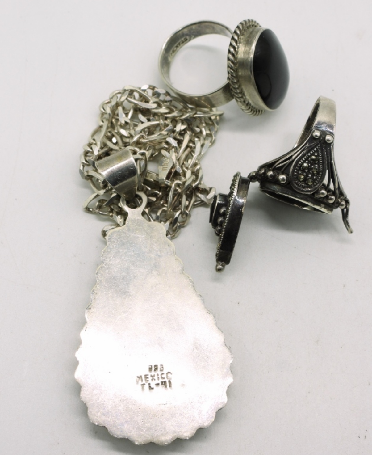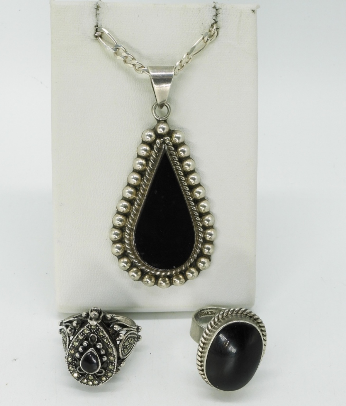 Two sterling rings, one opens (poison ring). Black onyx and marcasite. Rings size 7. Black onyx Taxco pendant (TL-41) 2.5″ long on a sterling 20″ chain. (30 dwt) (6x4x2)