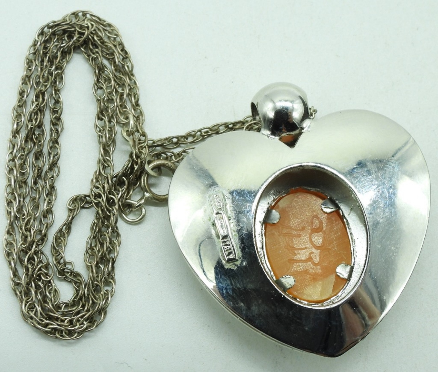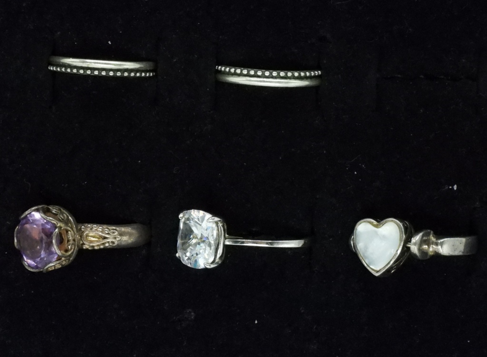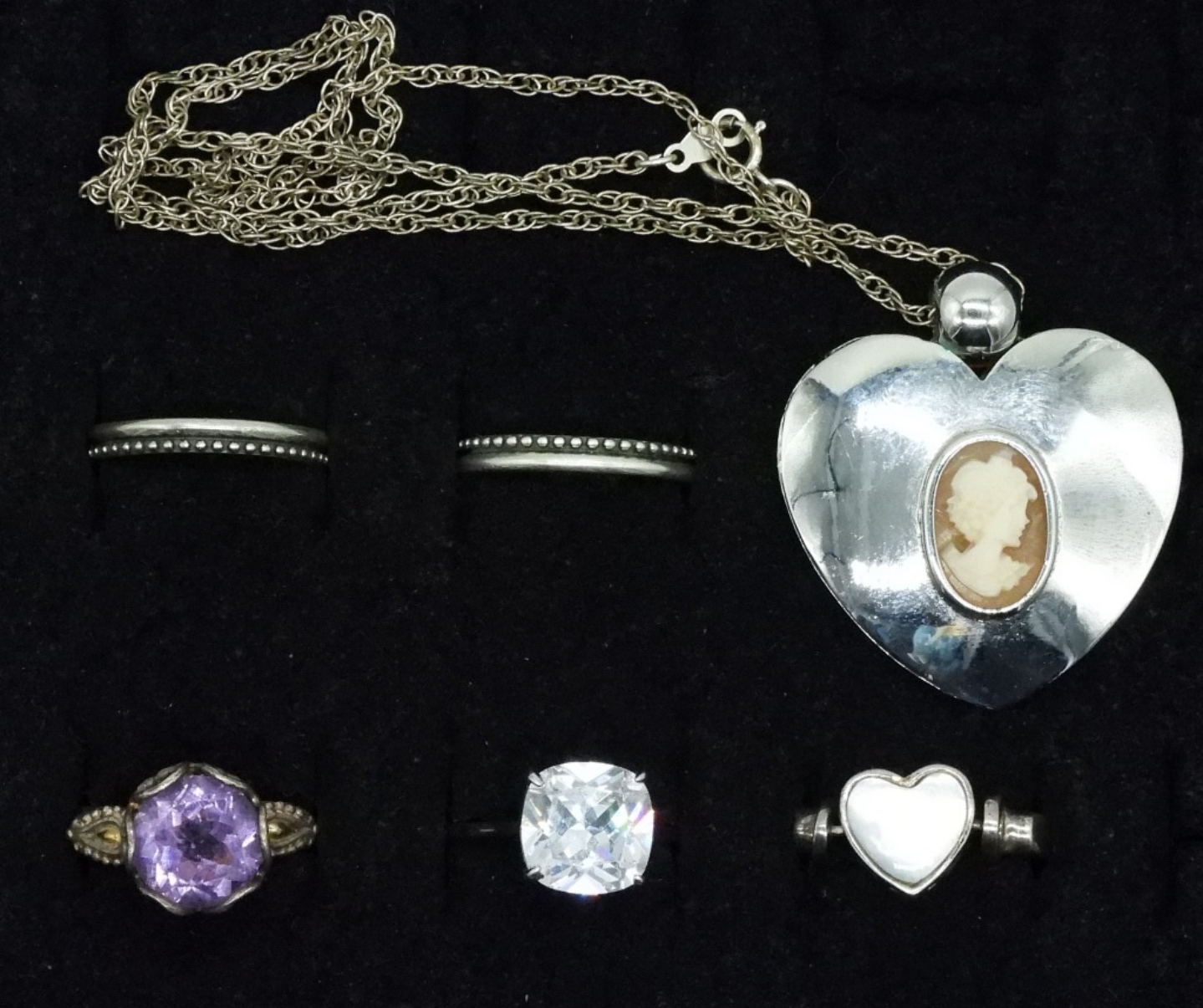 Sterling Cameo necklace, 18″ long. Five sterling rings, simulated diamond wedding set, amethyst & mother of pearl (two sided heart ring). Rings are size 6 & 7. (17.2 dwt) (6x4x2)