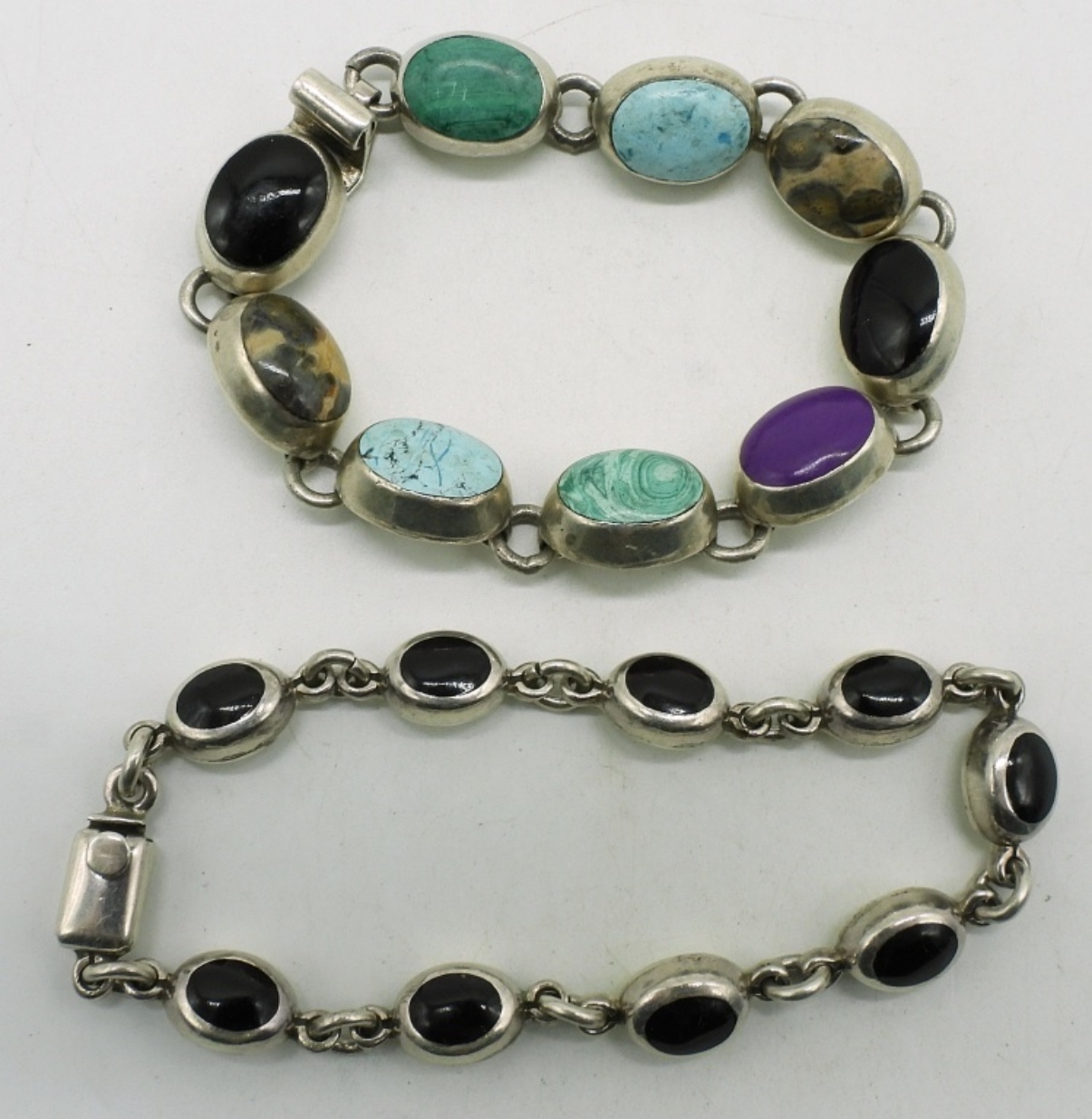 Two sterling bracelets, various gemstones. Larger bracelet is Taxco “TJ-71″, 7″ long. Clasp sticks, but works. Smaller bracelet is Mexico 925, with black obsidian, 7.5” long. (32 dwt) (6x4x2)