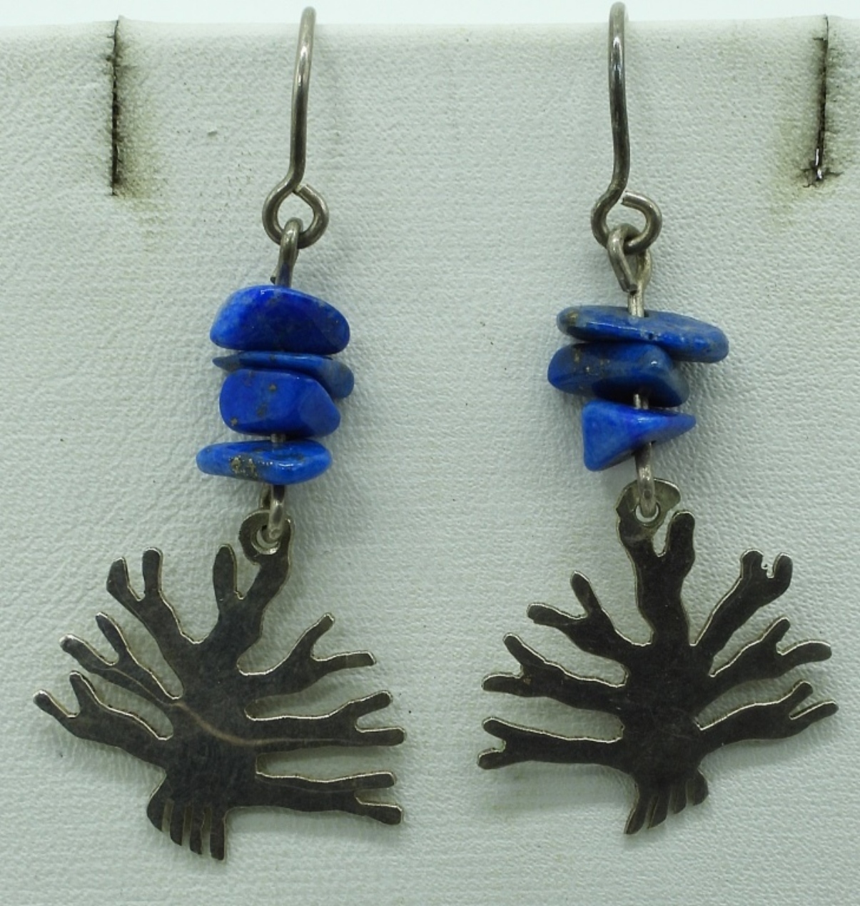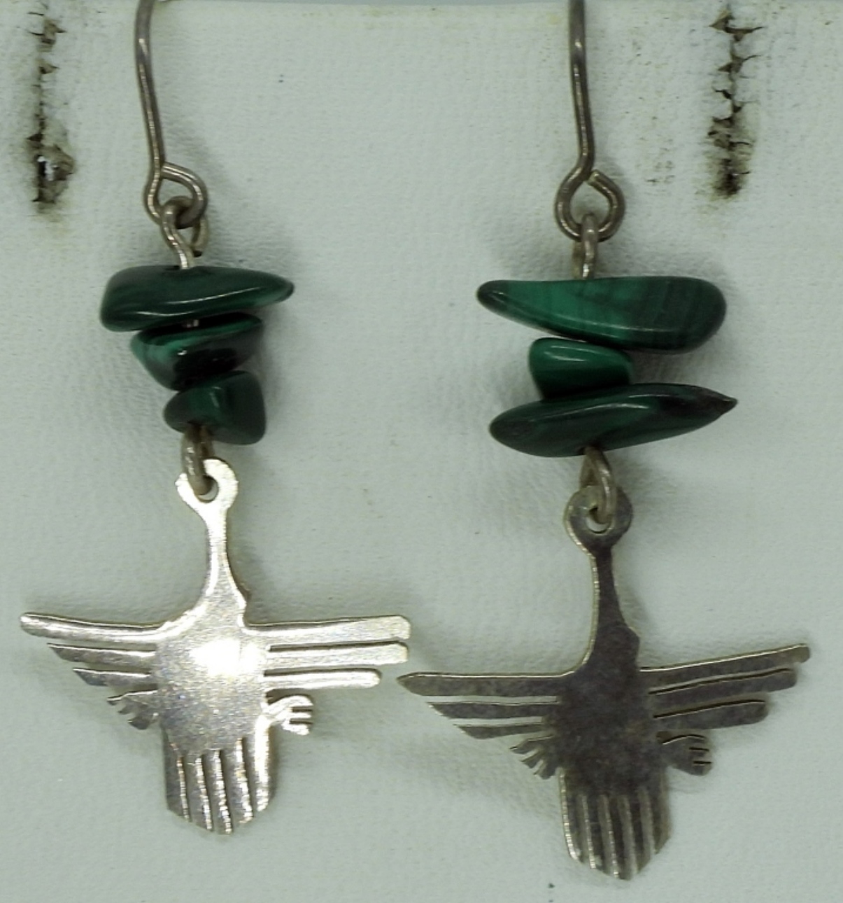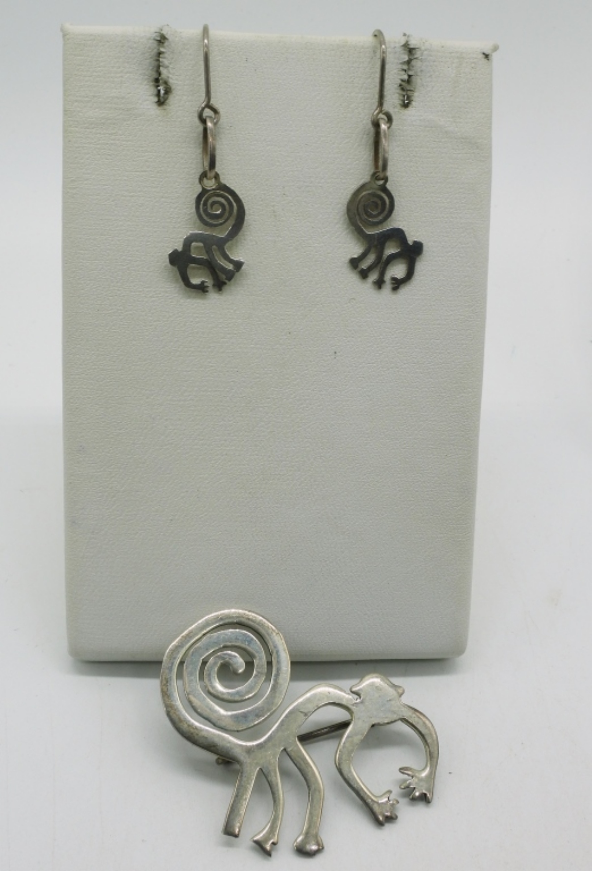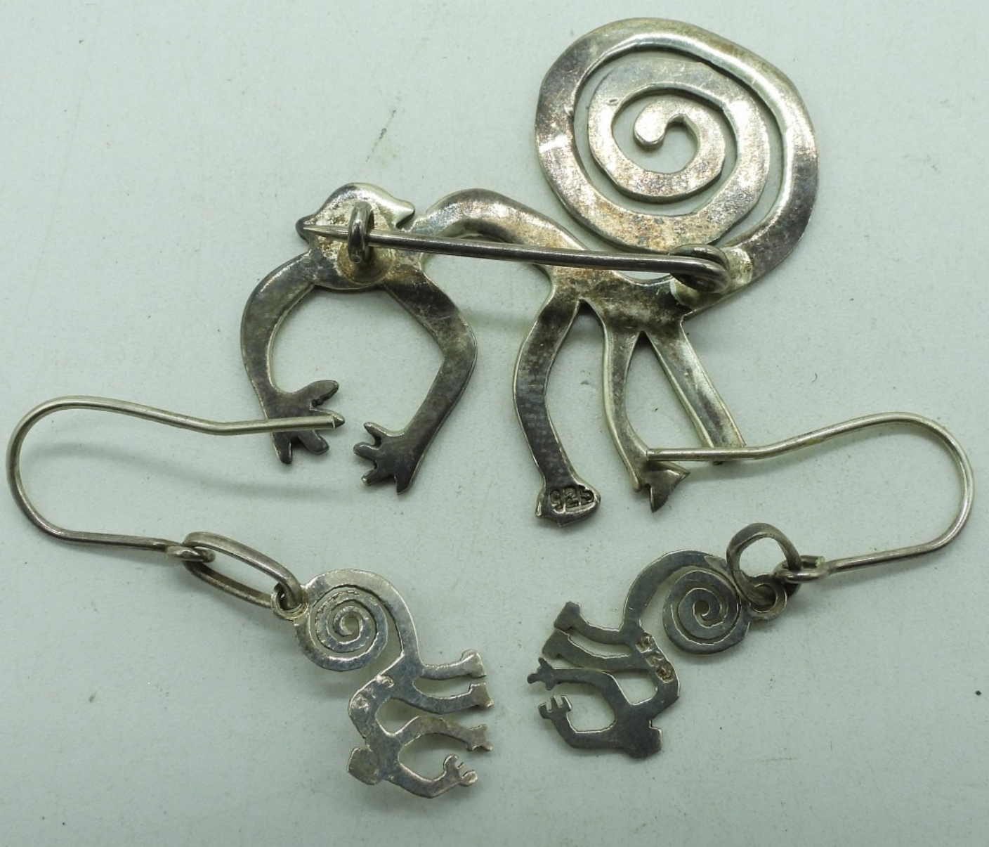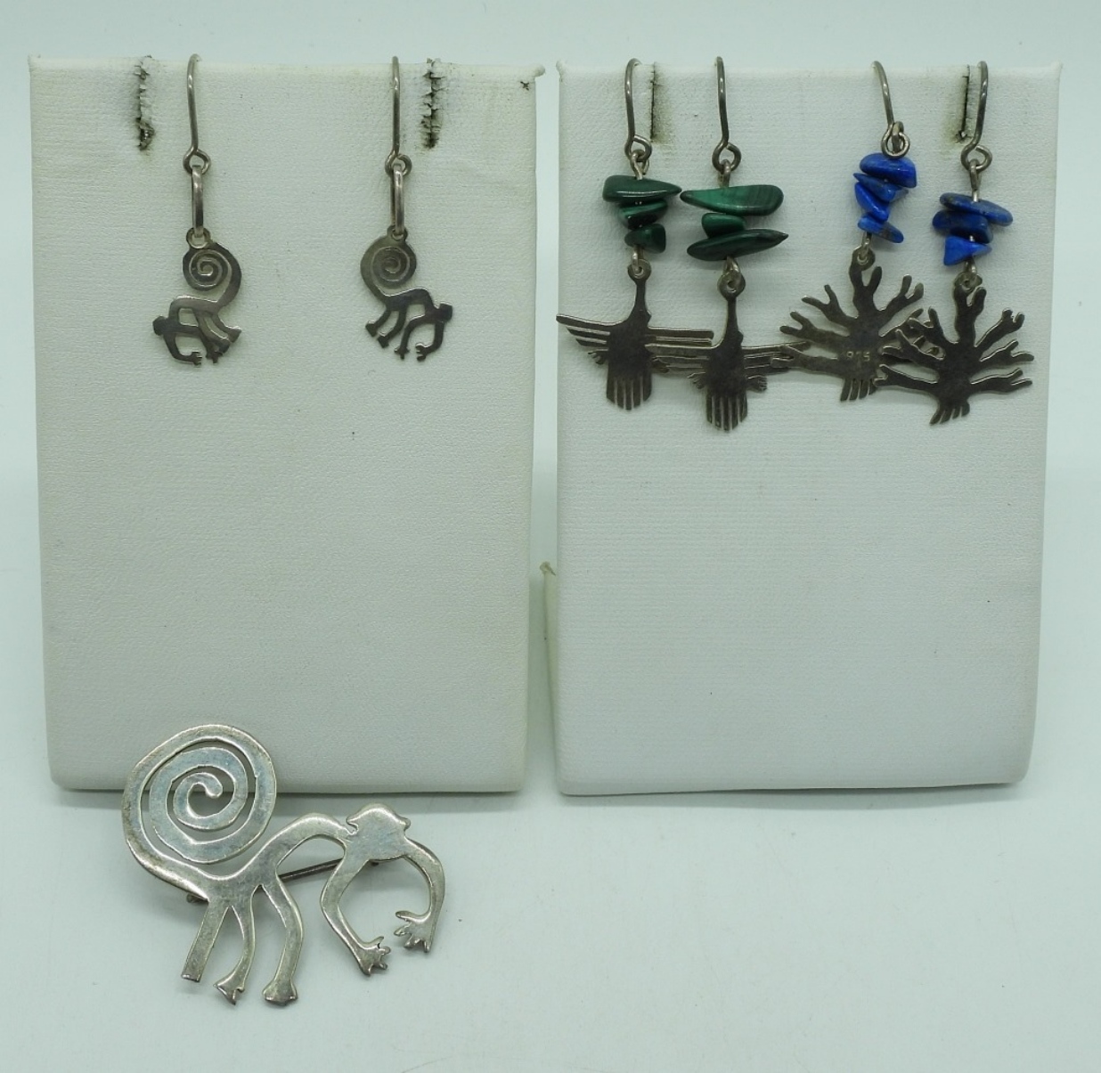 Peruvian Nazca Lines, Monkey pin and pierced earrings. Pin is 1.5″. Earrings hang 1″. Two other pair of sterling and gemstone pierced earrings. (8.5 dwt) (6x4x2)