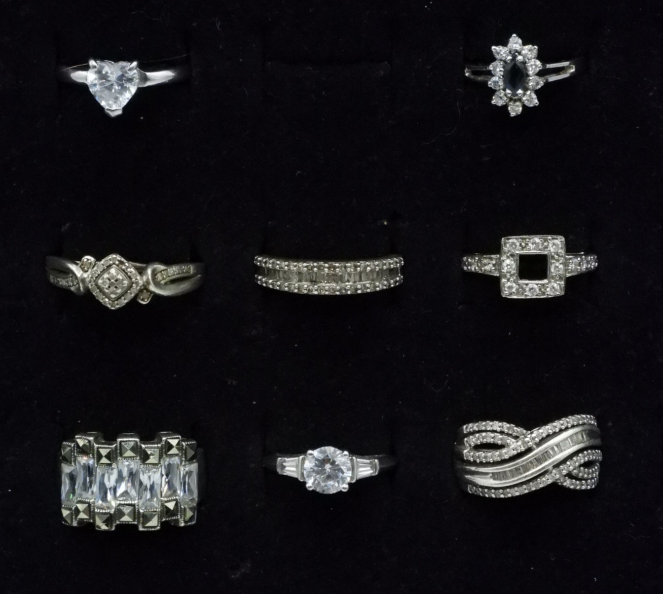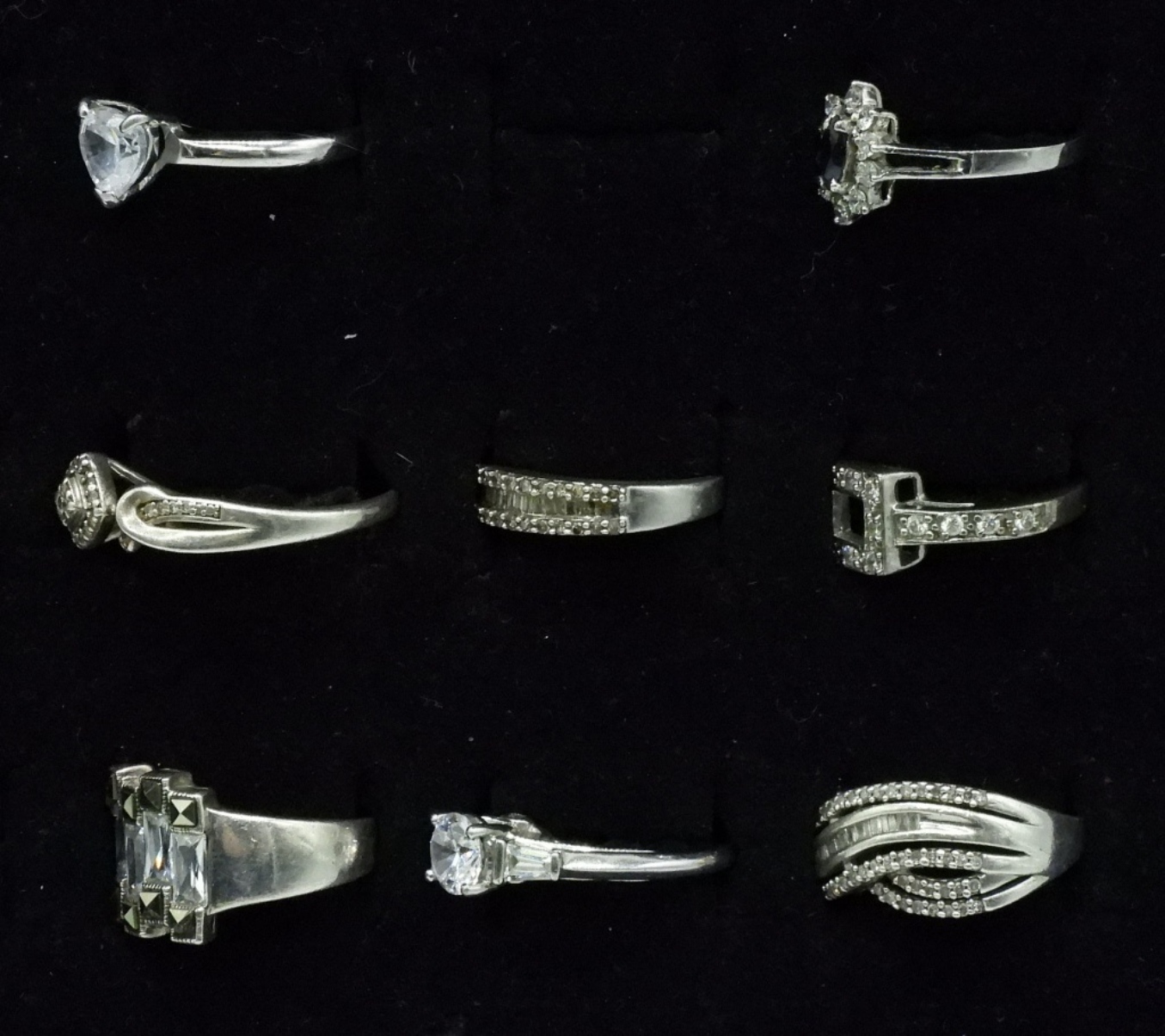 Eight sterling bridal style rings, simulated diamonds. Sizes 6-11 (20 dwt) (6x4x2)