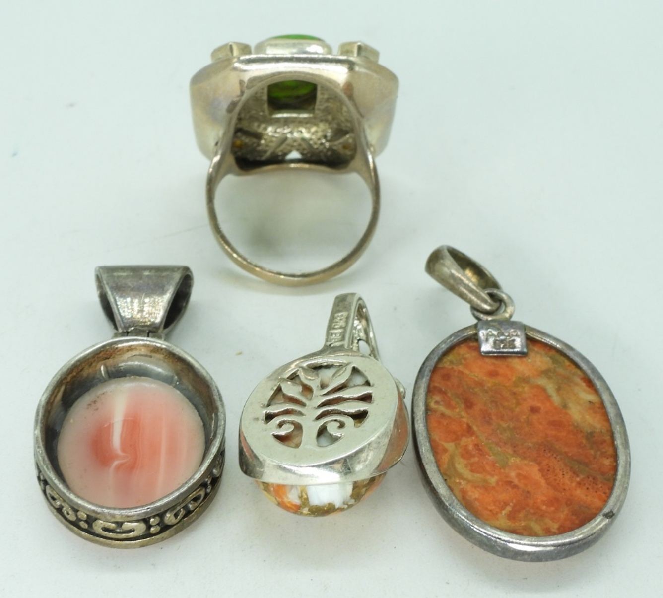 Three sterling pendants and one ring. Ring is green turquoise with other gemstones, size 9. Pendants are oyster copper turquoise and unverified gemstones, 1.5″ – 2″. (22 dwt) (6x4x2)