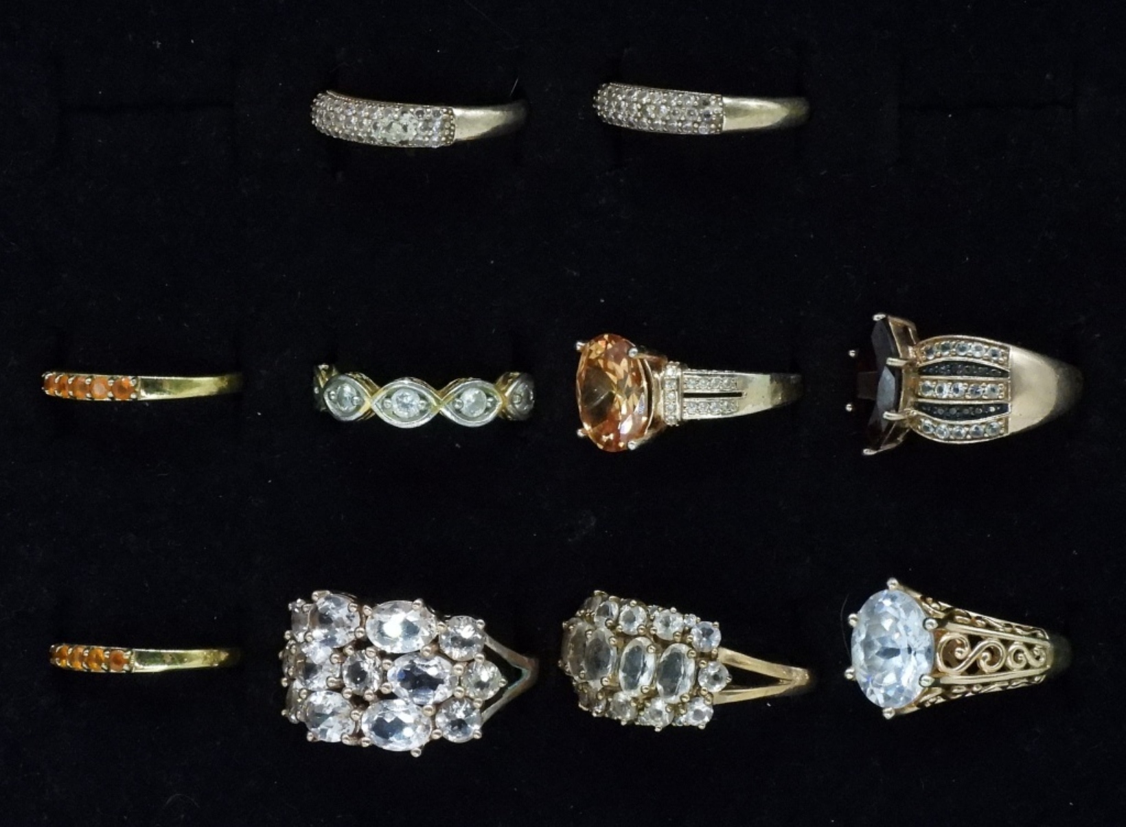 Ten sterling gemstone fashion rings. Simulated gemstones. Sizes 7-9 (25 dwt) (6x4x2)