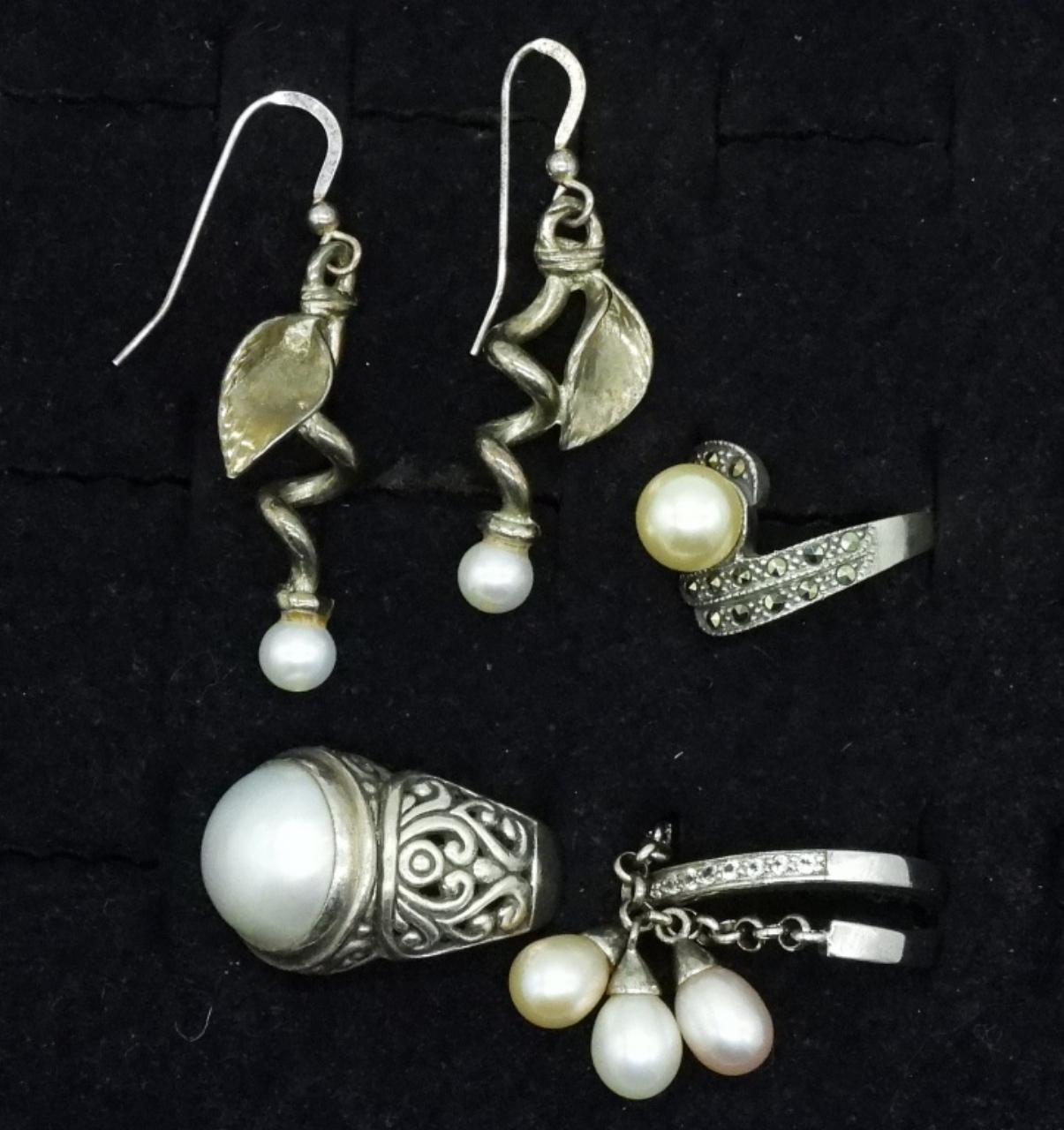 Three sterling pearl rings, sizes 6.5, 8, 10. One pair of sterling pierced pearl earrings, 2″ long. (19 dwt) (6x4x2)