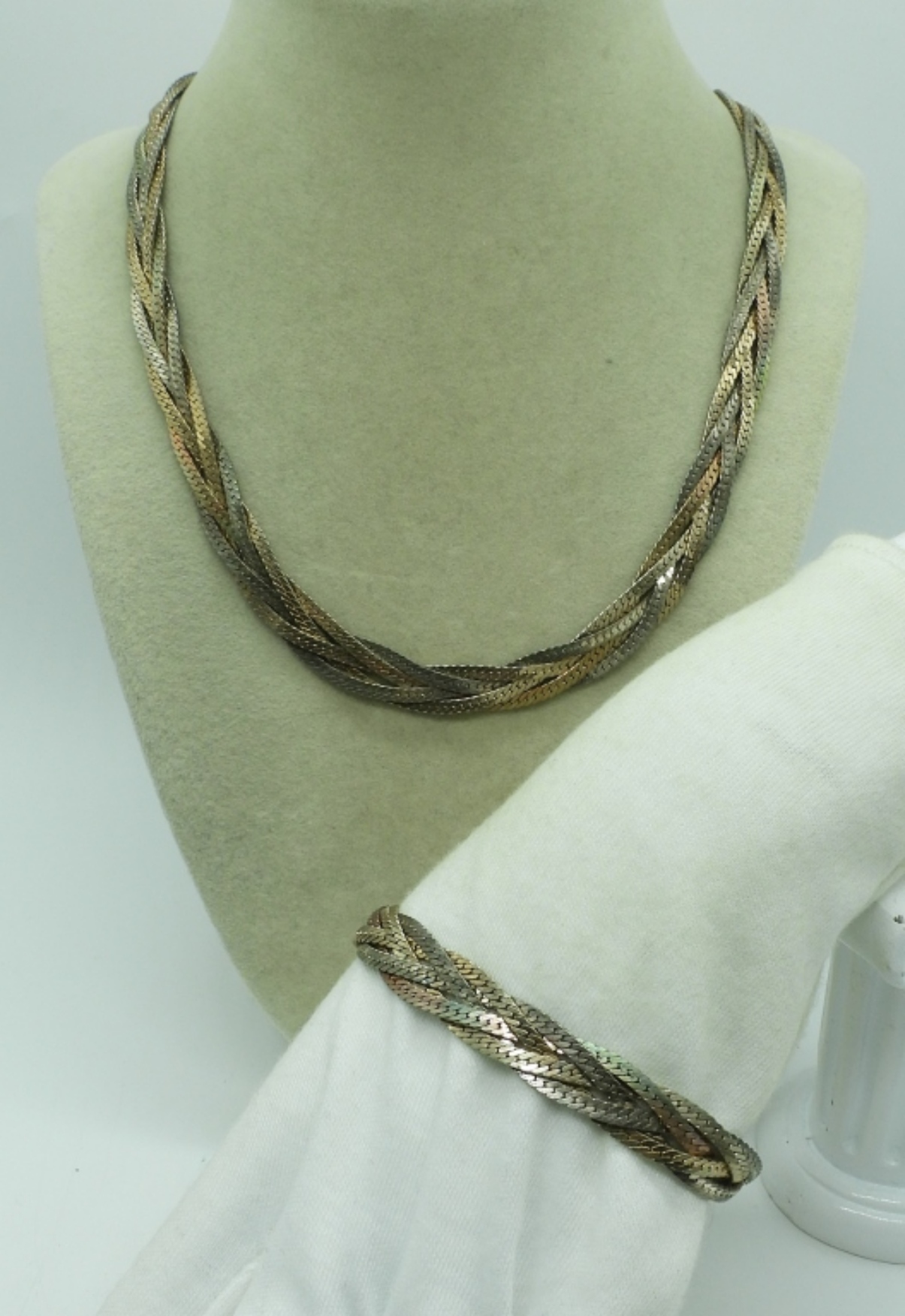Vintage sterling braided multi chain, two tone necklace 24″ long. Matching bracelet, 7.5″ long. (43.4 dwt) (6x4x2)