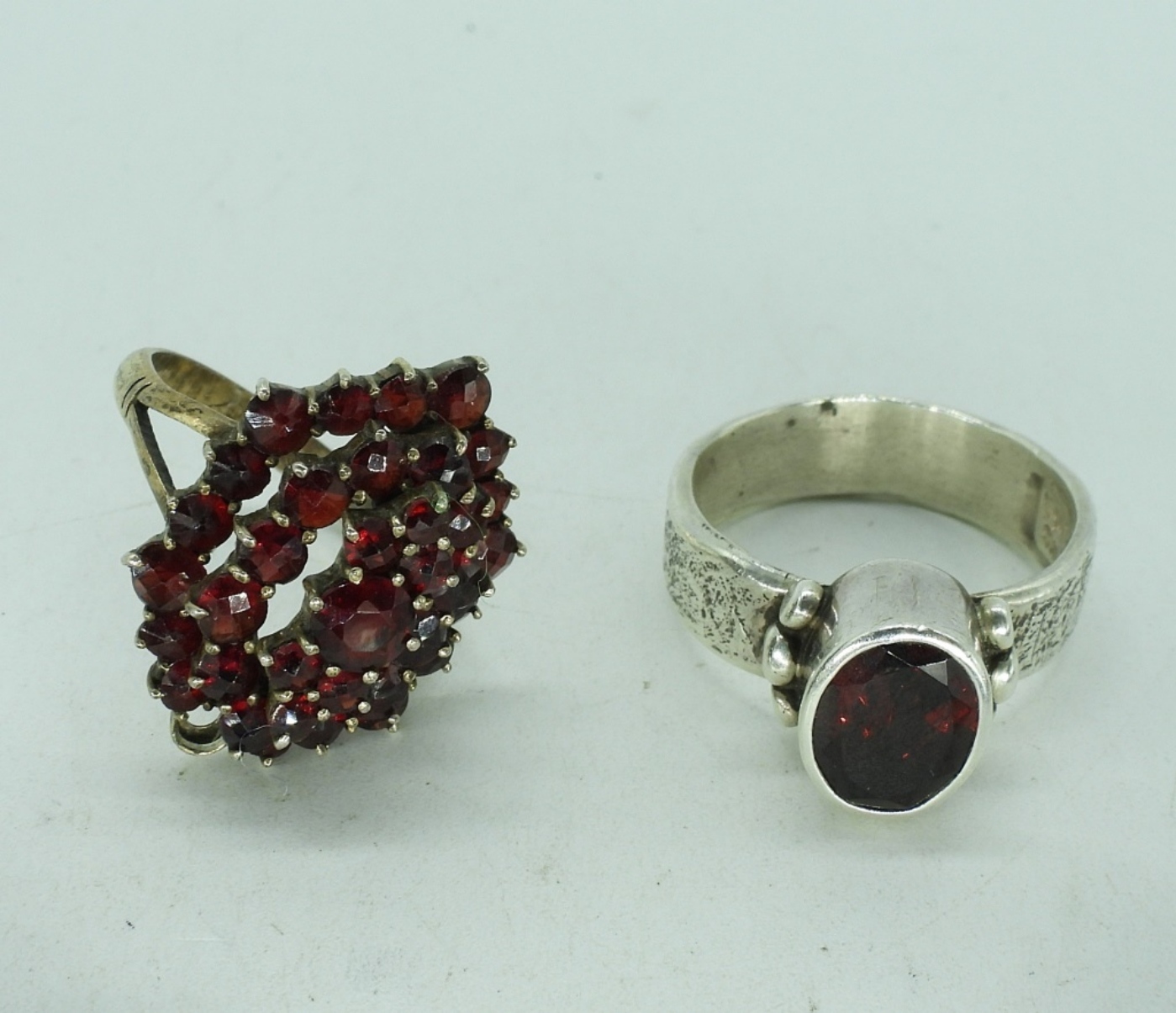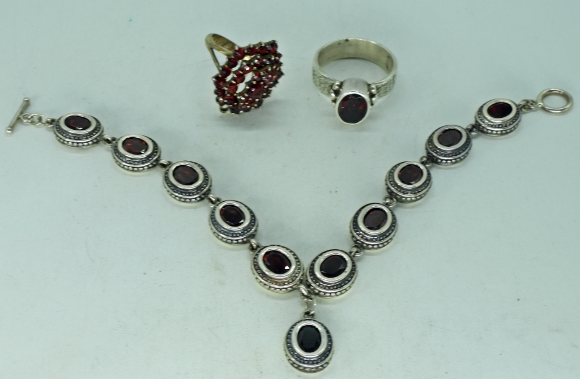 Two sterling rings with Garnet gemstones, sizes 6.5 & 9. Sterling 7″ bracelet with 11 Garnet gemstones. (19 dwt) (6x4x2)