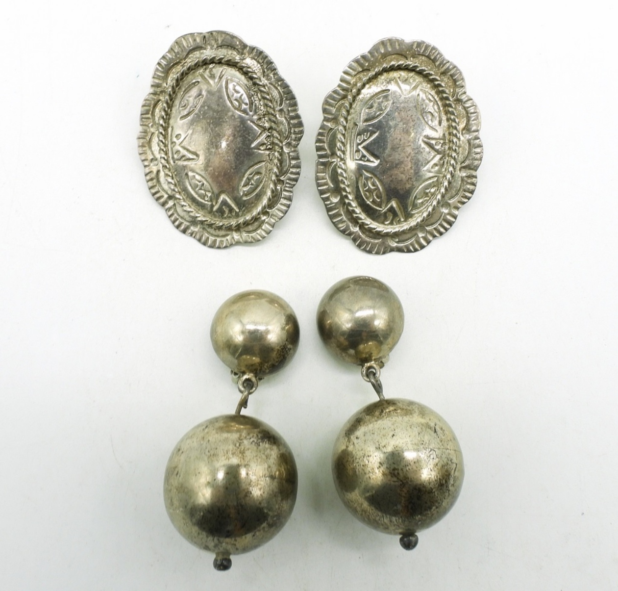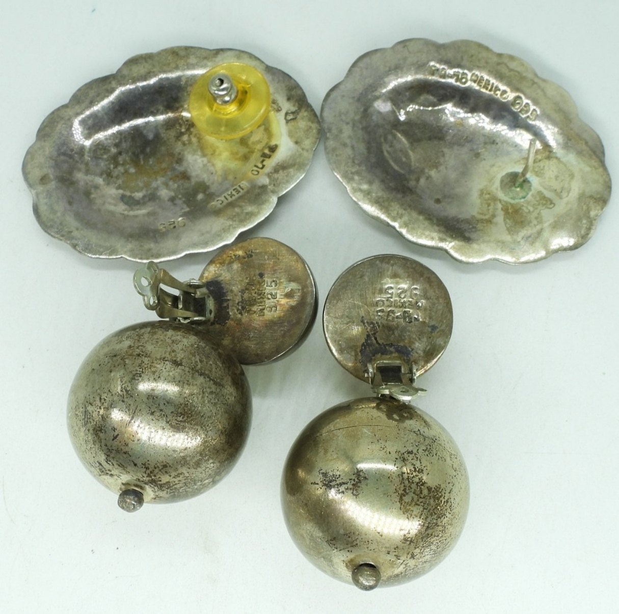 Two pair of Taxco sterling earrings. Oval pierced earrings are Taxco “TA-70 Mexico 925″, 2” long. Sterling ball clip on, Taxco earrings “TB-95 Mexico 925”. 2″ long. (33 dwt) (6x4x2)