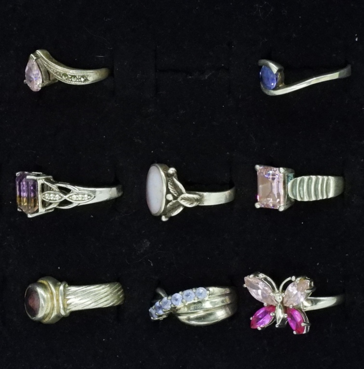 Eight sterling rings with pink and purple gemstones. Sizes 5.5 – 8 (24 dwt) (6x4x2)