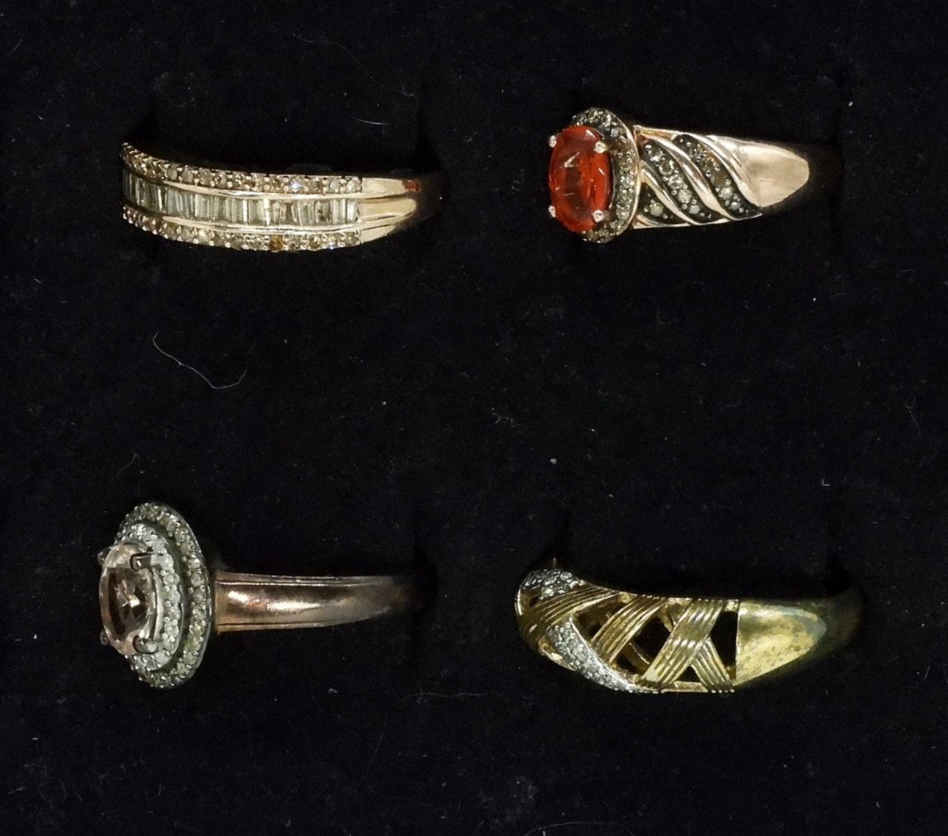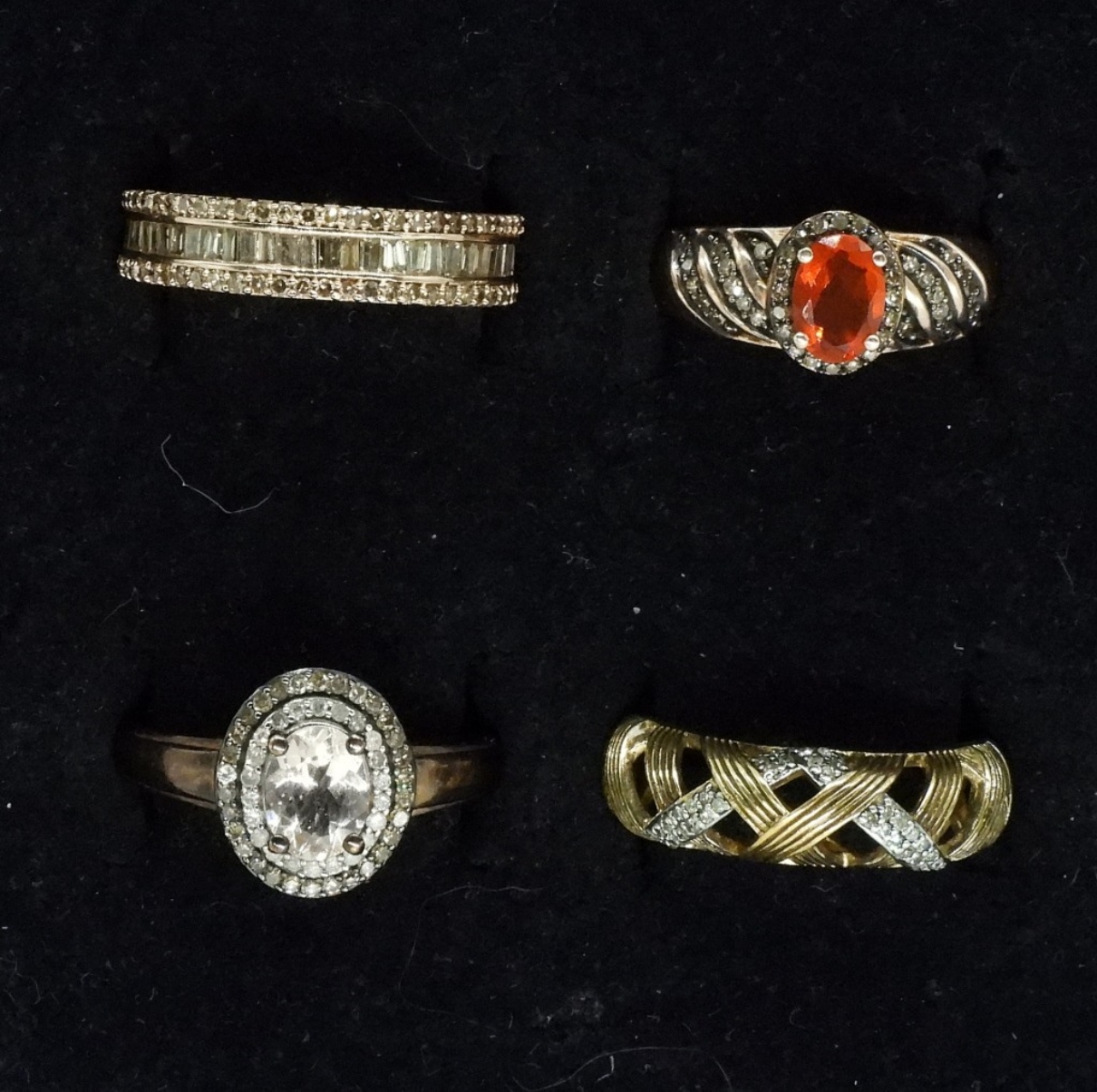 Four gorgeous sterling rings with gold tones. Diamonds have been tested and are genuine! One ring features a Morganite gemstone and another features a Orange Fire Opal gemstone. Ring sizes are 6, 8, 9. (10.6 dwt)