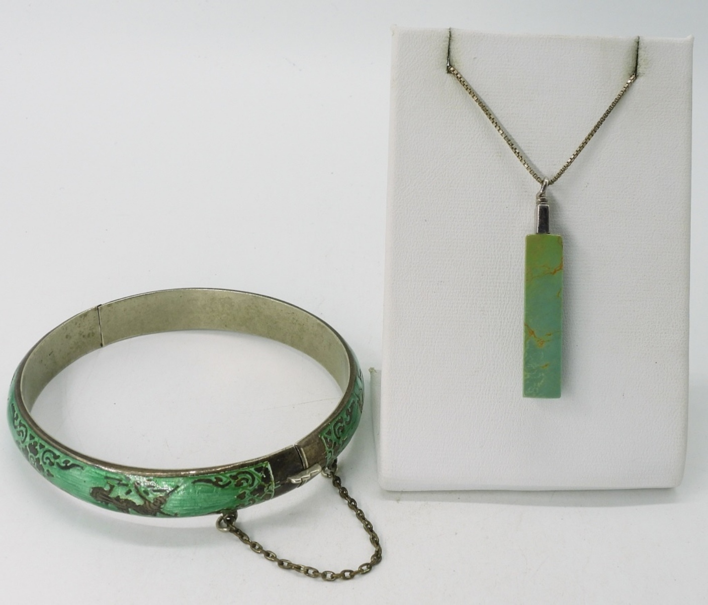 Green turquoise pendant, 1.5″ long. On a 18″ sterling chain. Green Siam sterling bangle bracelet. (16.1 dwt) (6x4x2)