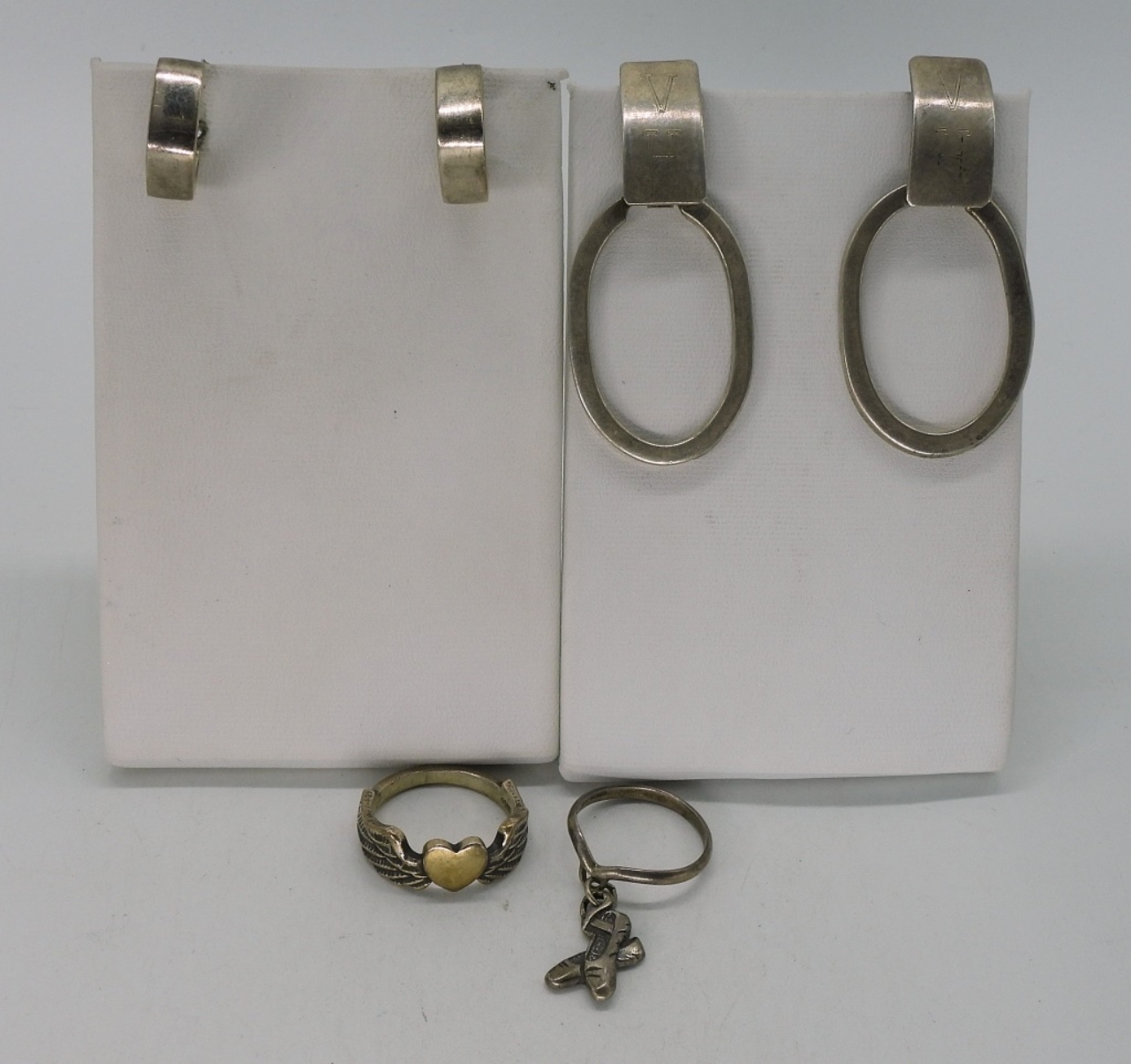One pair of pierced Taxco (TV-124 Mexico 925) 2″ long. Two rings, sizes 6 & 7.5 (17.3 dwt) (6x4x2)