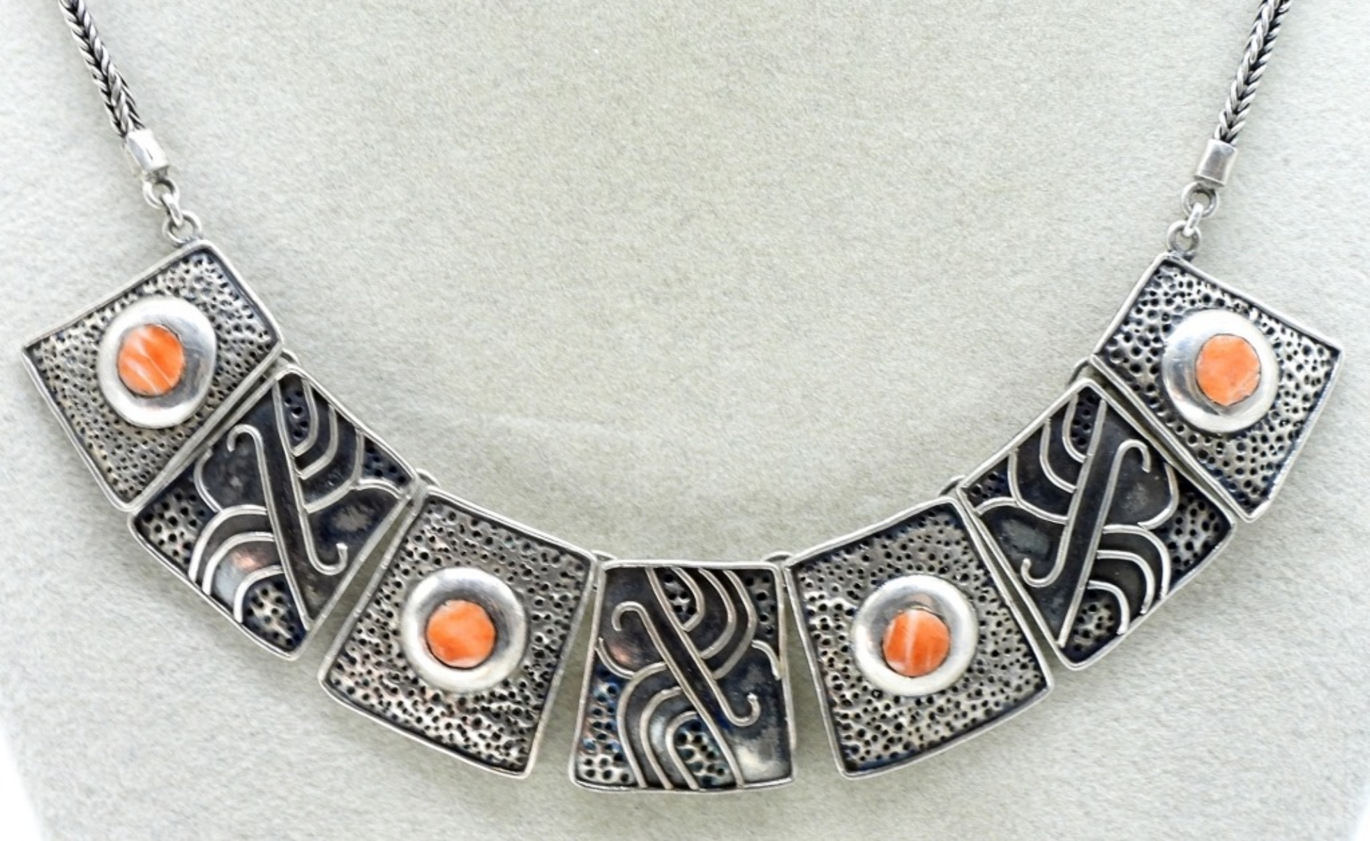 Small coral gemstones set in a 950 silver necklace, 18″. (19.5 dwt) (6x4x2)