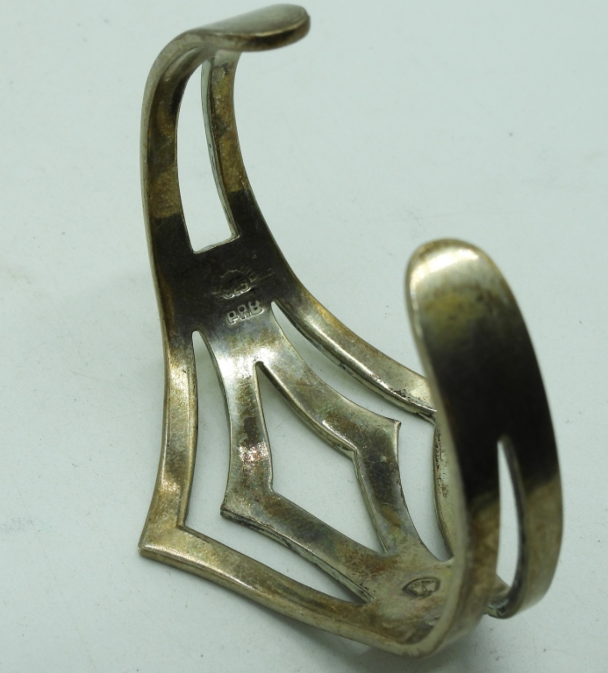 Sterling cuff bracelet, Mexico. Three sterling rings with turquoise & malachite gemstones. Rings are 7, 7.5, 10. (30.4 dwt) (6x4x2)