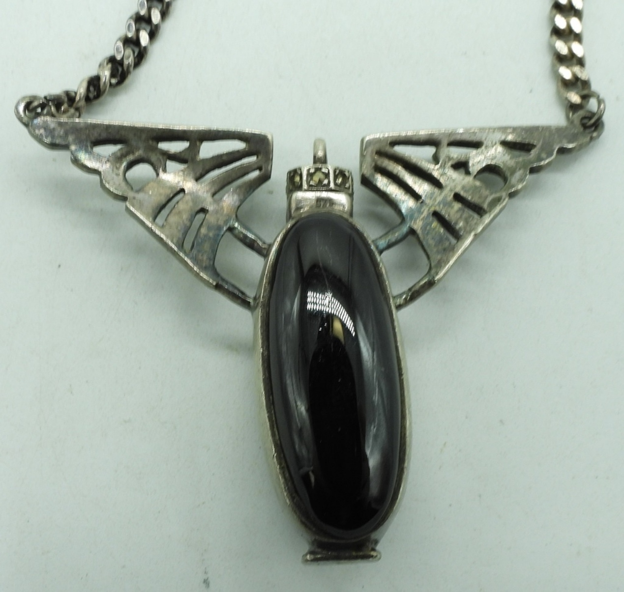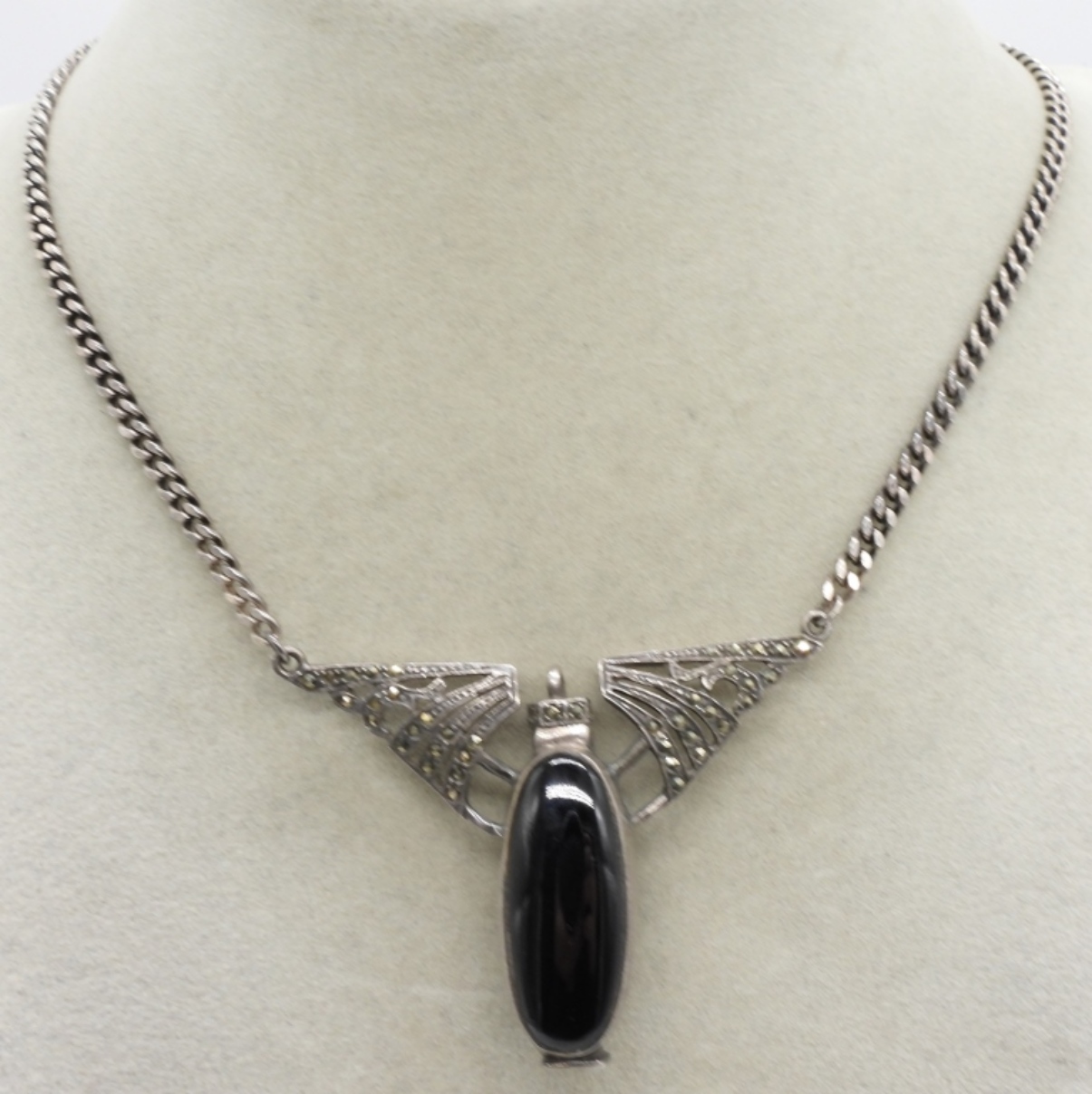 Vintage art deco, sterling necklace with marcasite and black onyx. Top screw open, perfume bottle. Necklace is 18″ long. Pendant is 2″ x 2″. (18 dwt) (6x4x2)