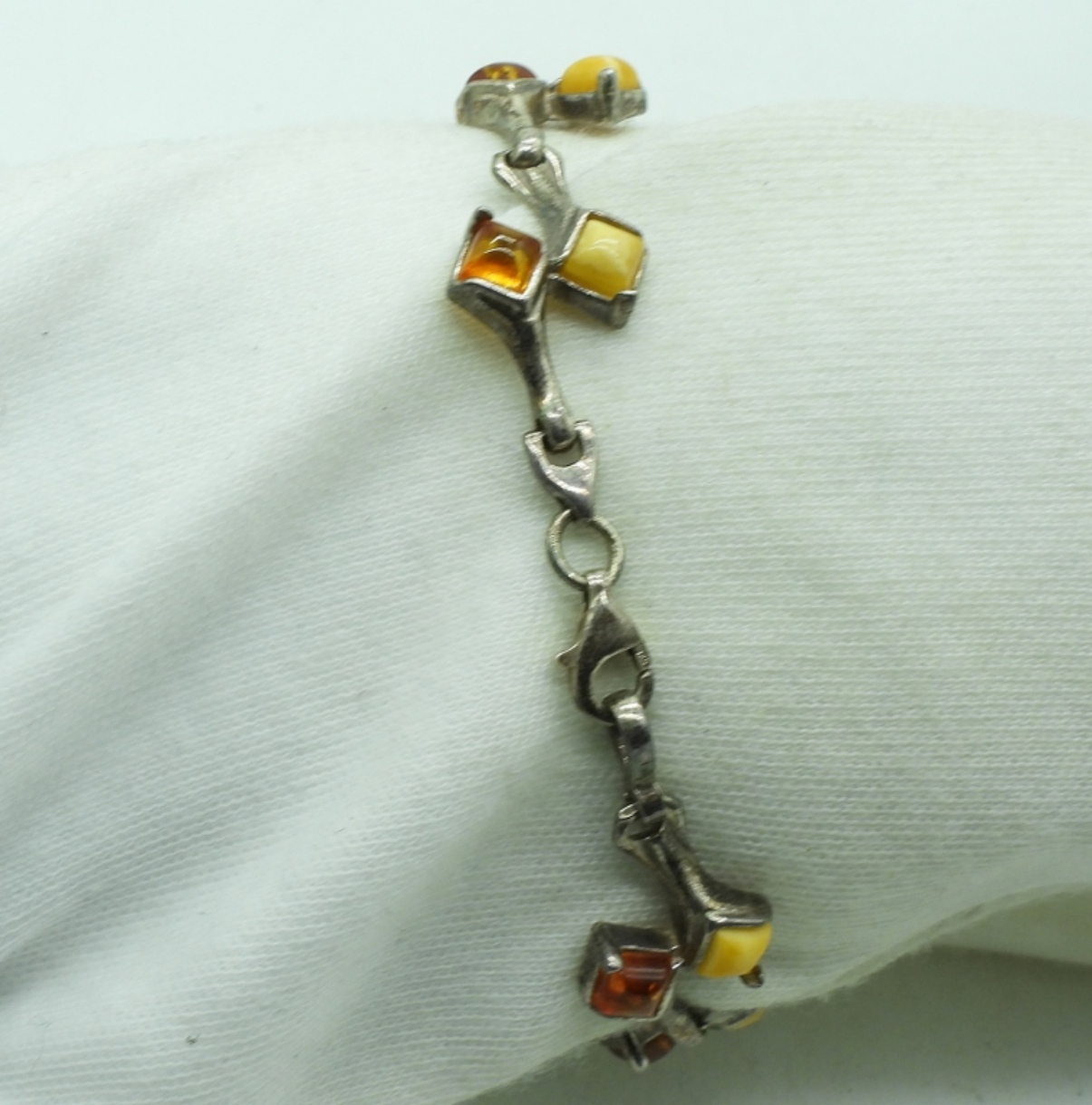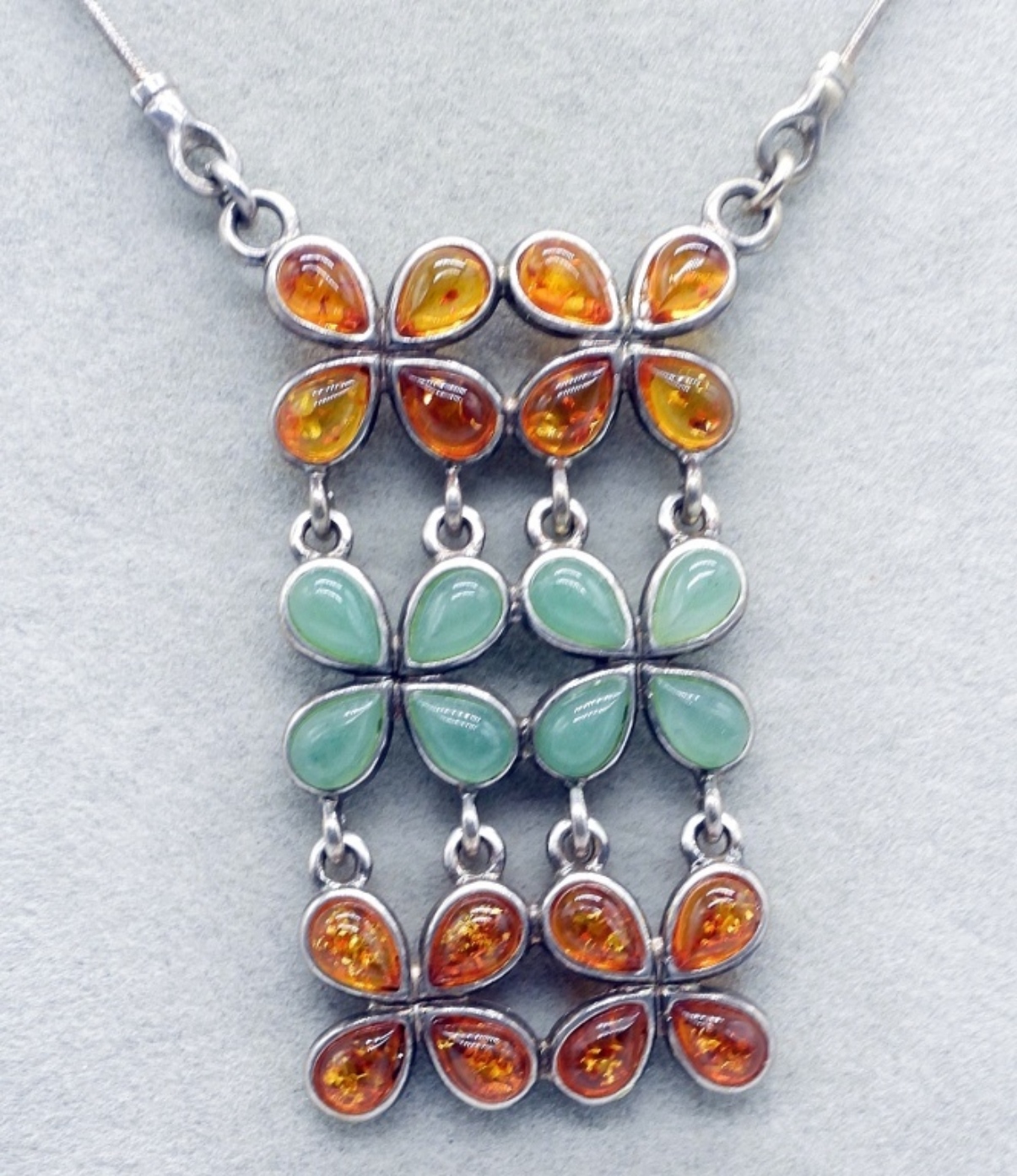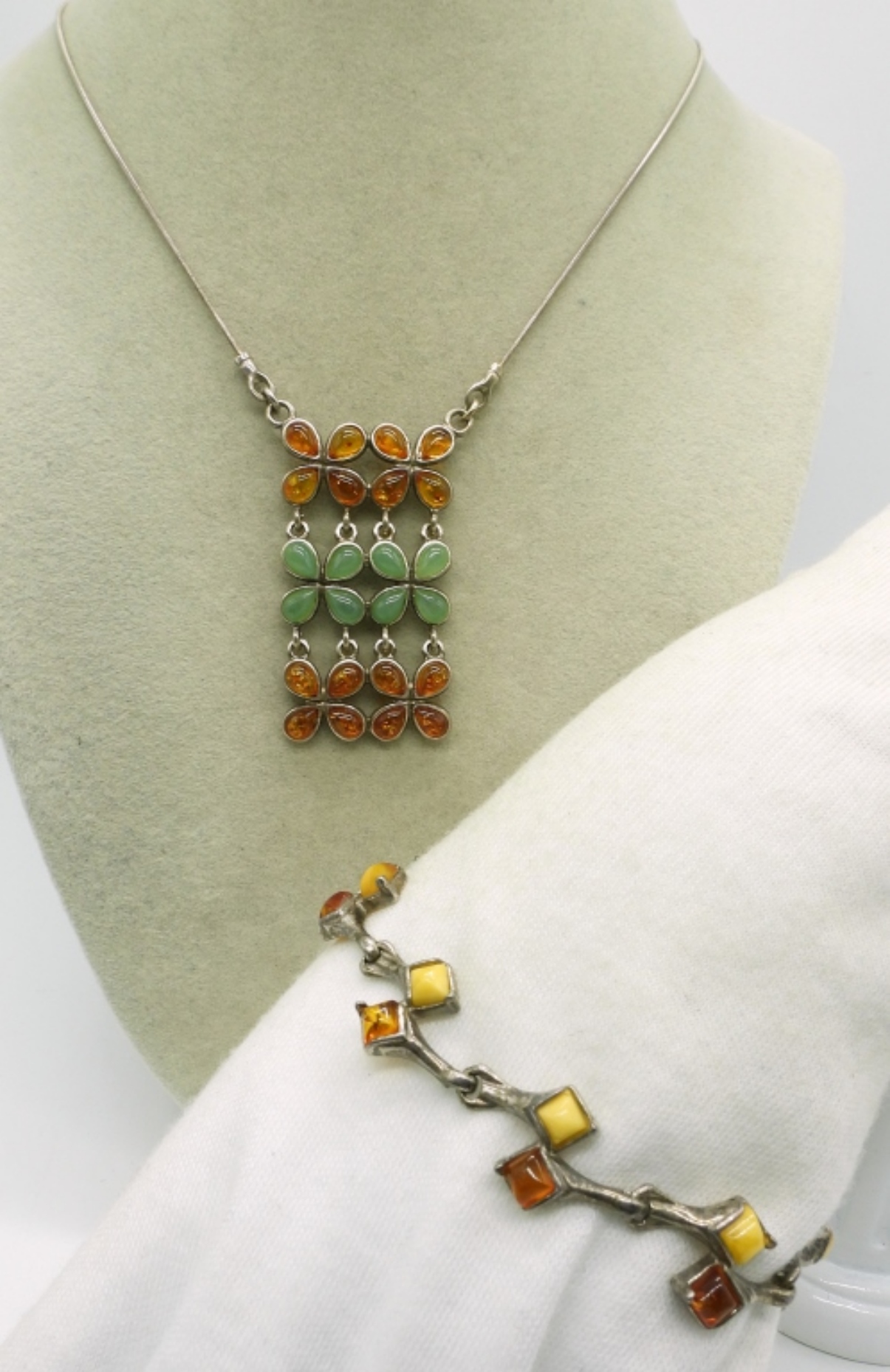 Amber & Jade gemstones in sterling. Necklace is 16″. Bracelet is 7″. (15.7 dwt) (6x4x2)