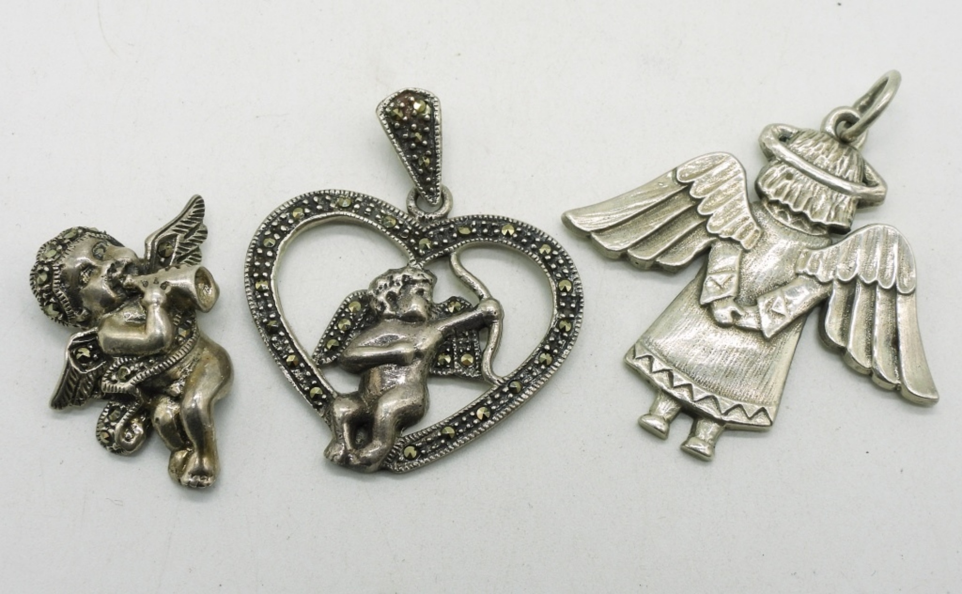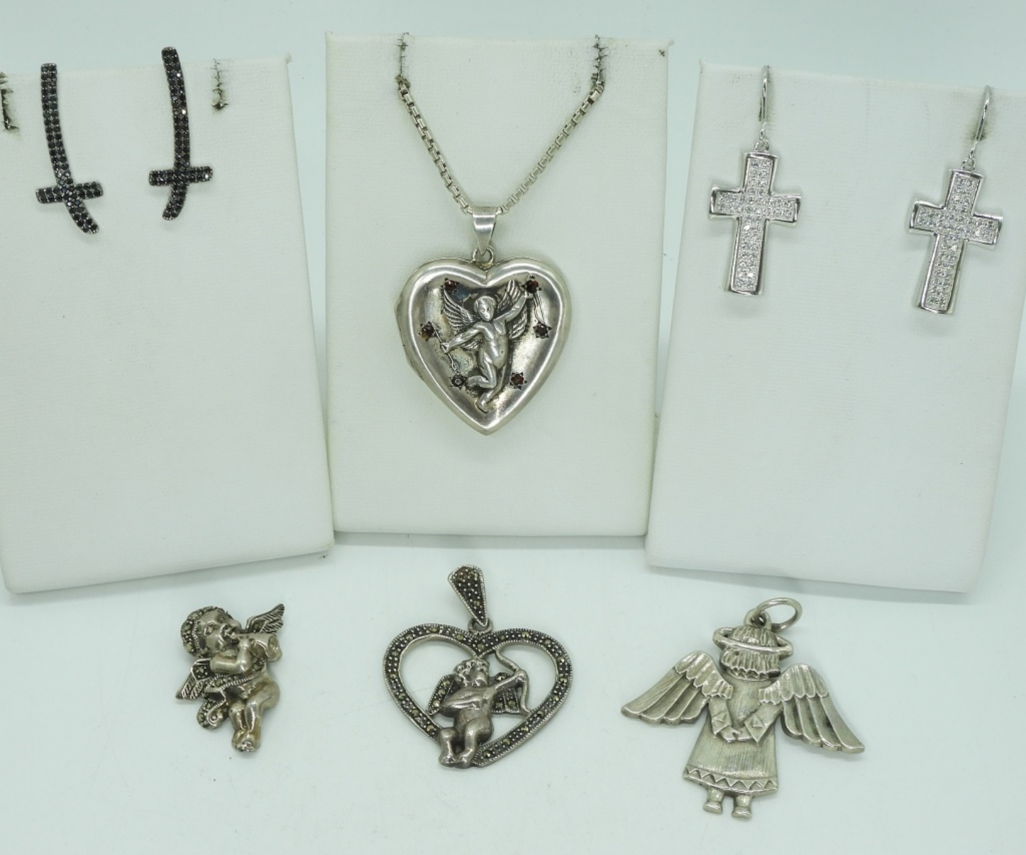 Locket Necklace, 20″ long. Locket is 1.5″ long. Two pair of cross pierced earrings, 1″ – 1.5″ long. Three loose sterling pendants, 1″ – 2″. (32 dwt) (6x4x2)