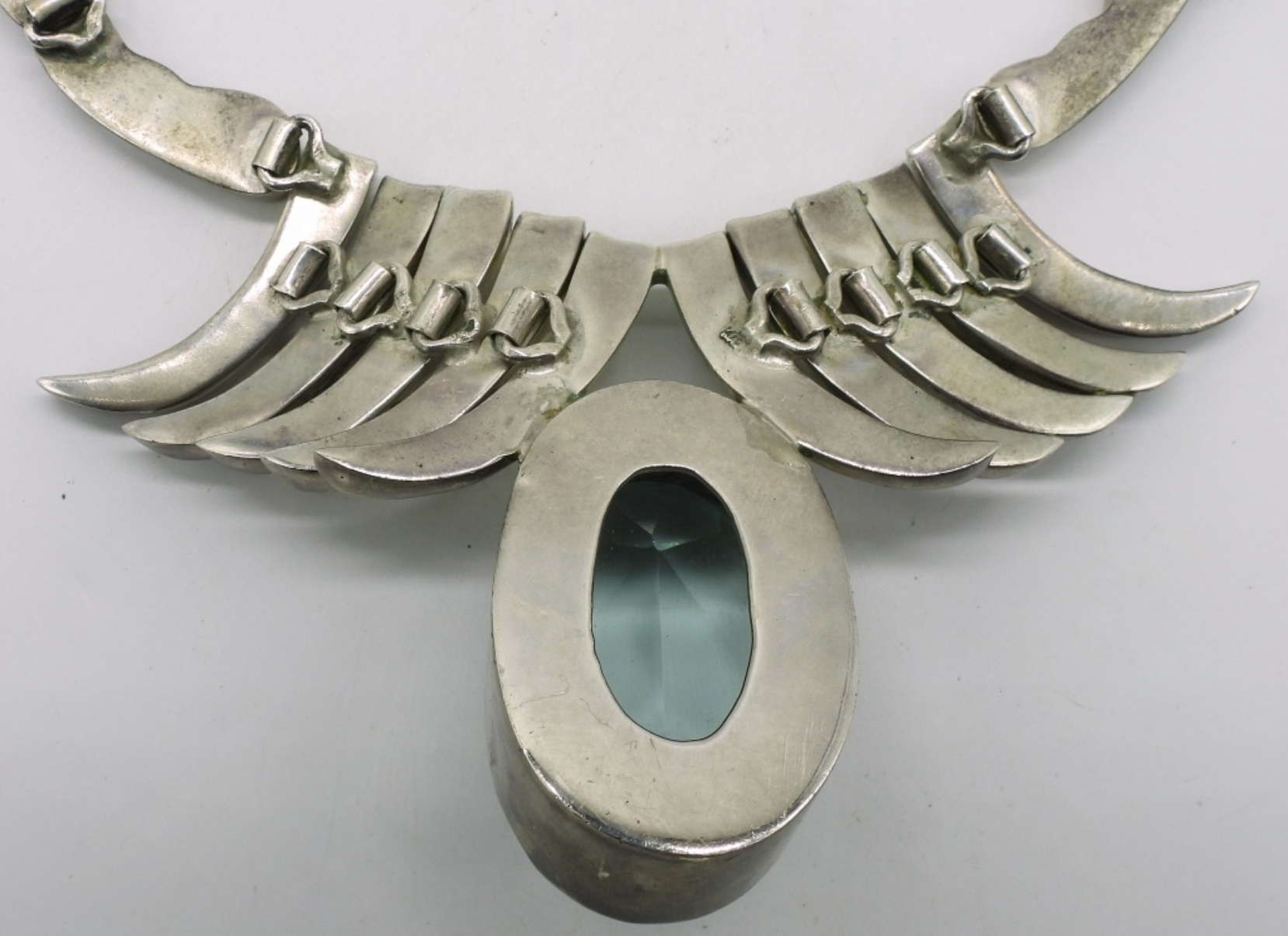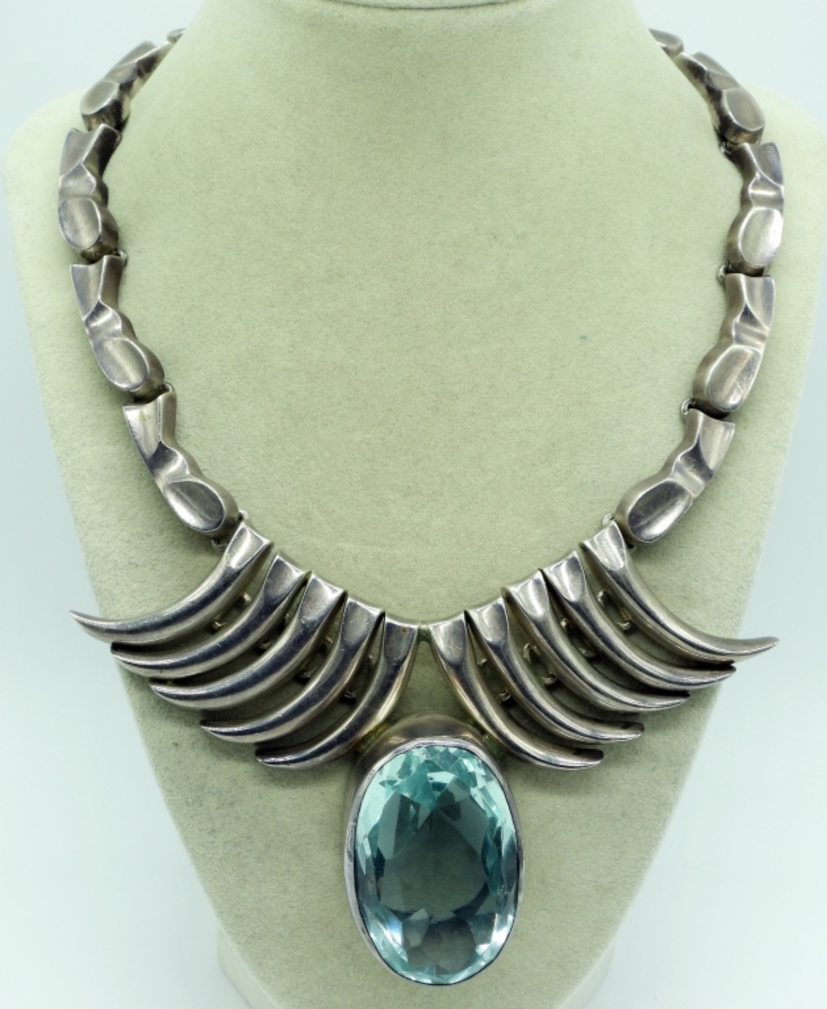 Huge sterling necklace with very large blue topaz gemstone. Taxco TA-41 Mexico 925. Gemstone measures 2″ long, 1.5″ wide, 1″ deep. 20″ long necklace. (200 dwt) (6x4x2)