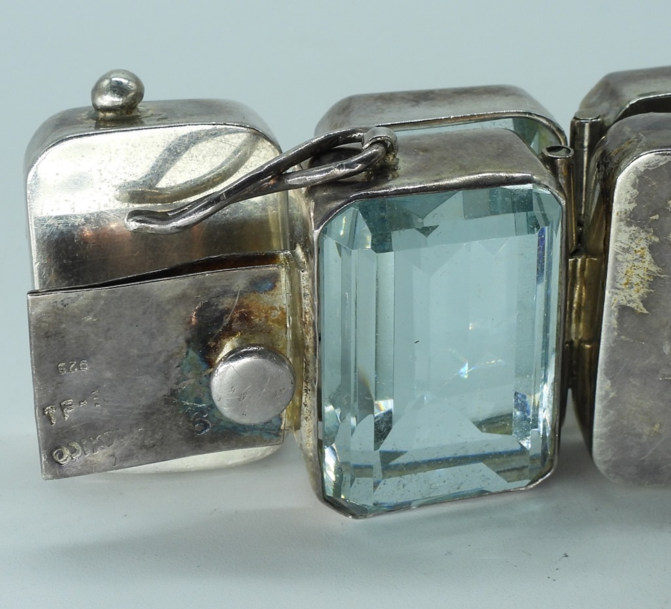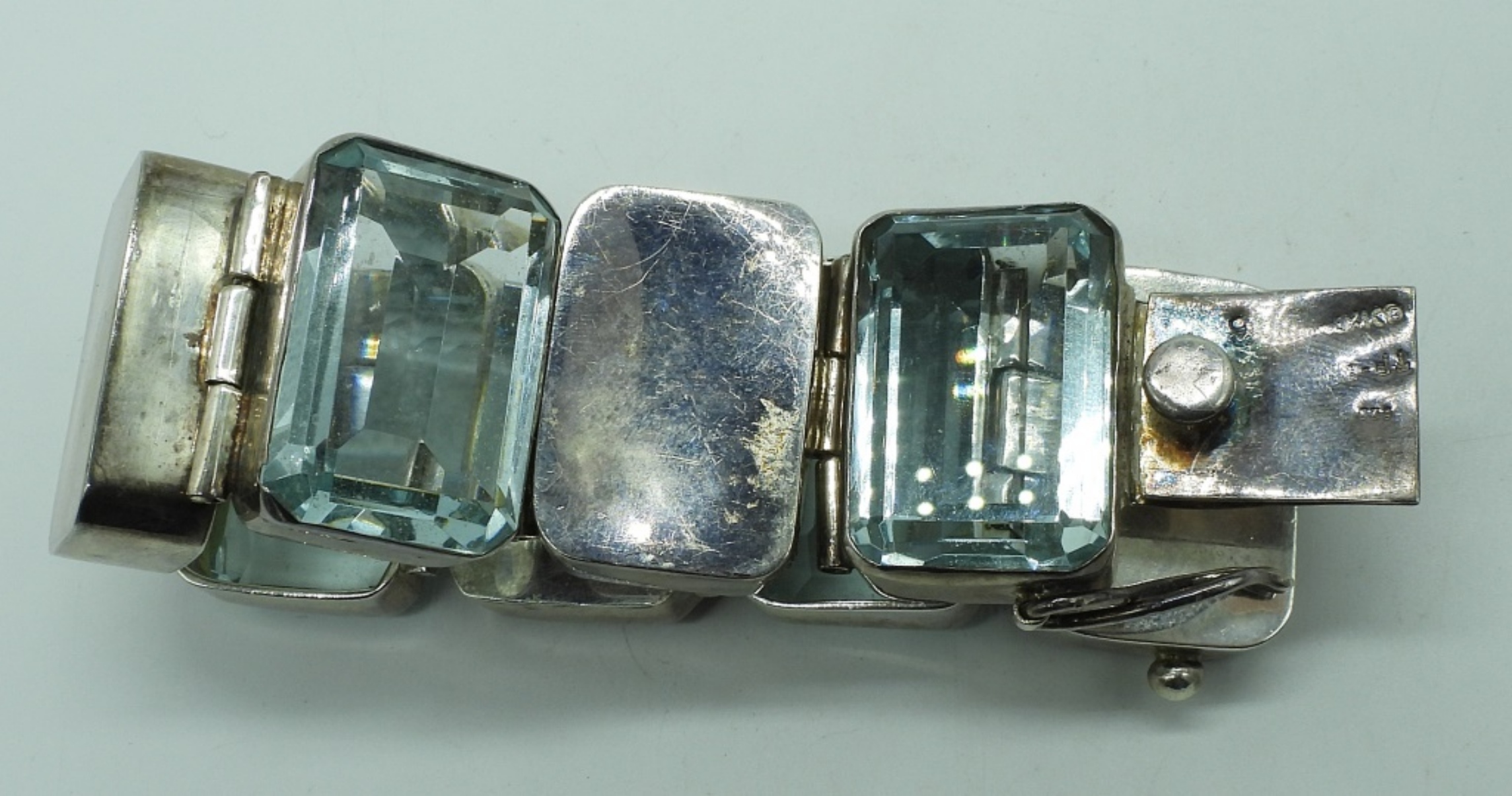 Large Taxco sterling, blue topaz gemstones bracelet. Taxco TF-3? (stamp has faded). 8″ long. (77.3 dwt) (6x4x2)