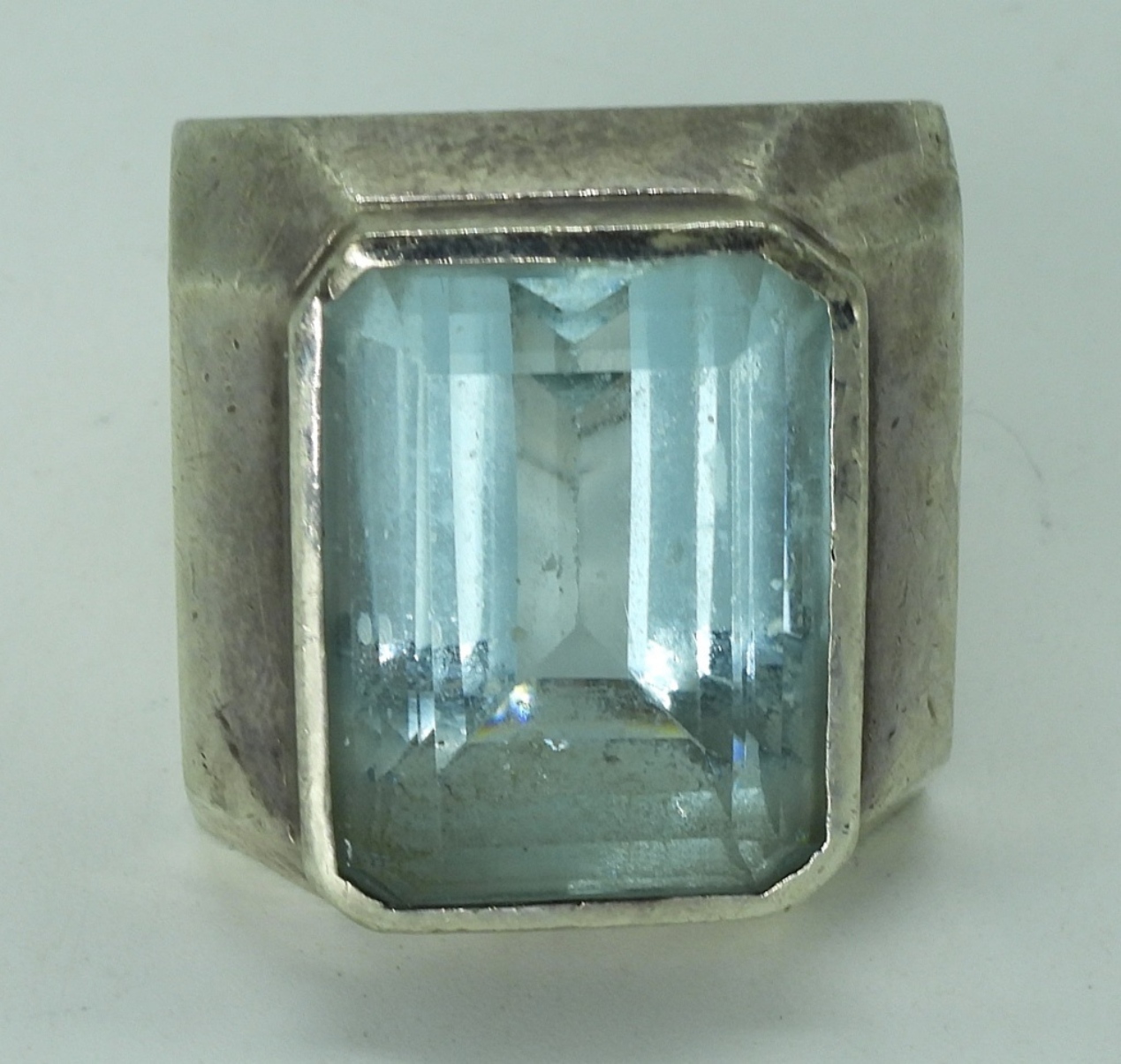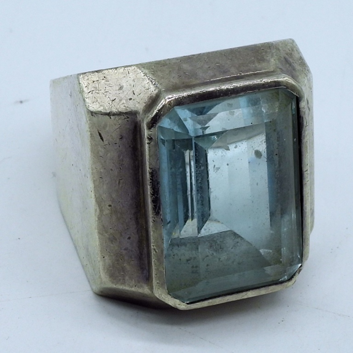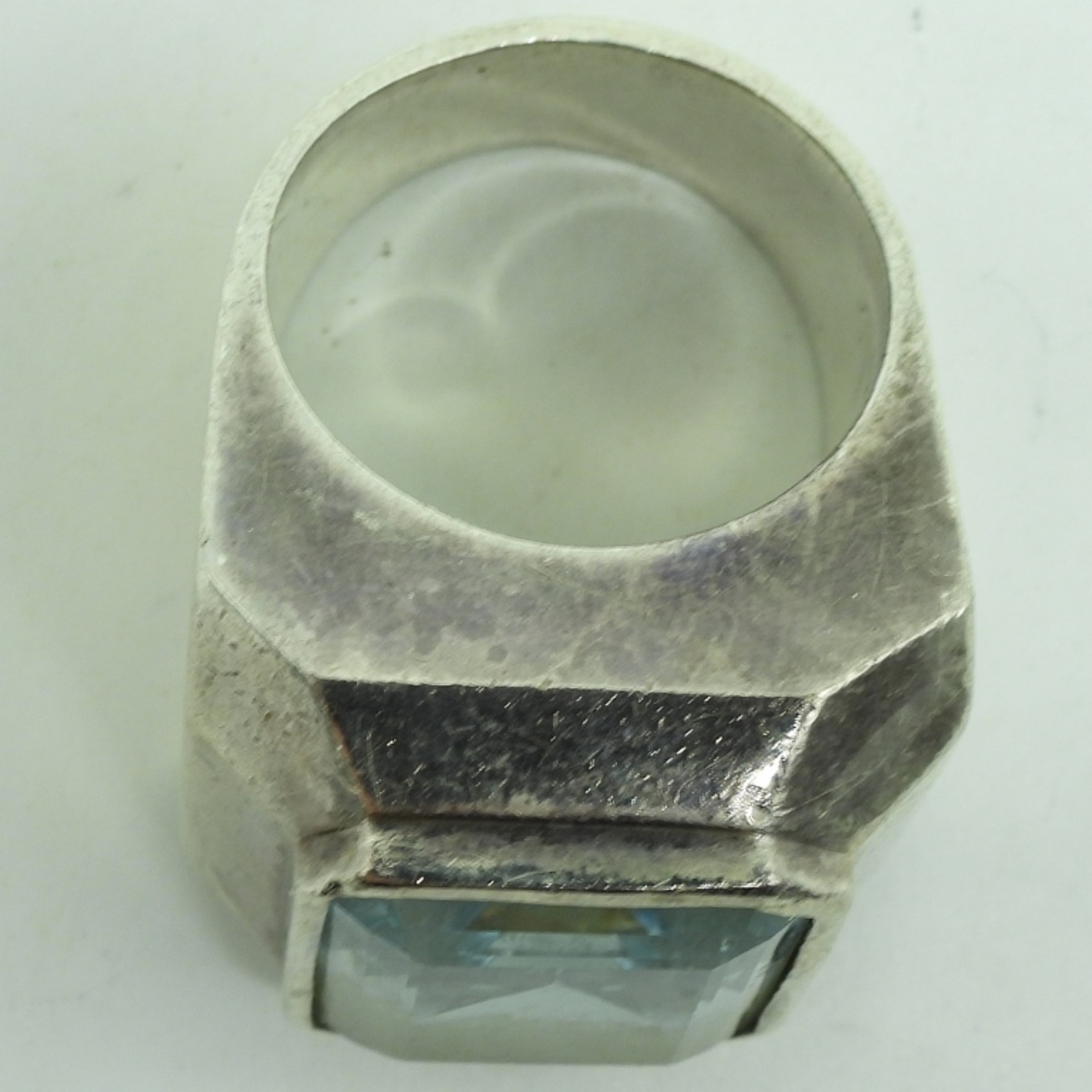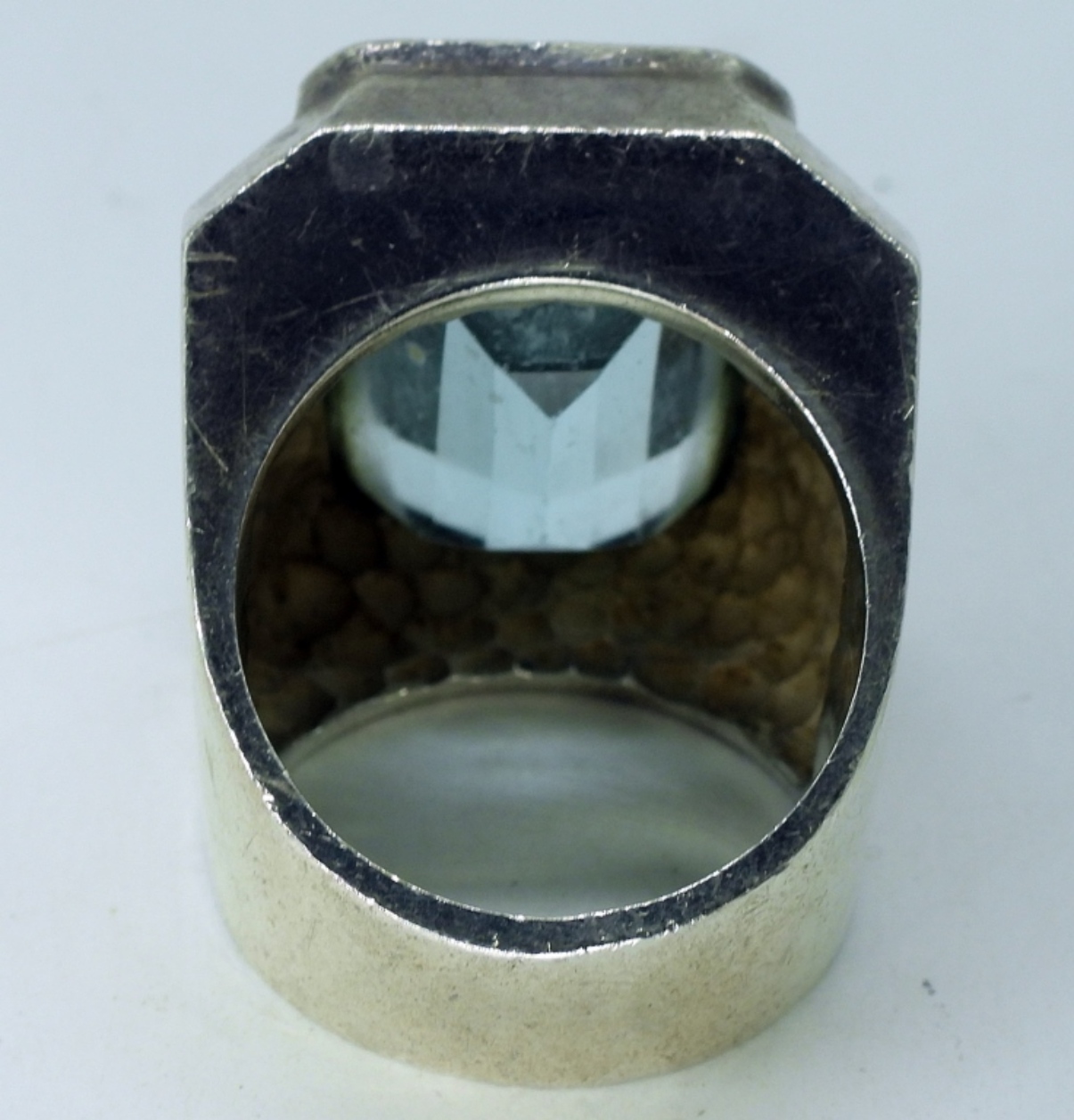 Sterling ring with a very large blue topaz gemstone. Ring is size 10. Gemstone measures 1″ long, 3/4″ wide. (21.9 dwt) (6x4x2)