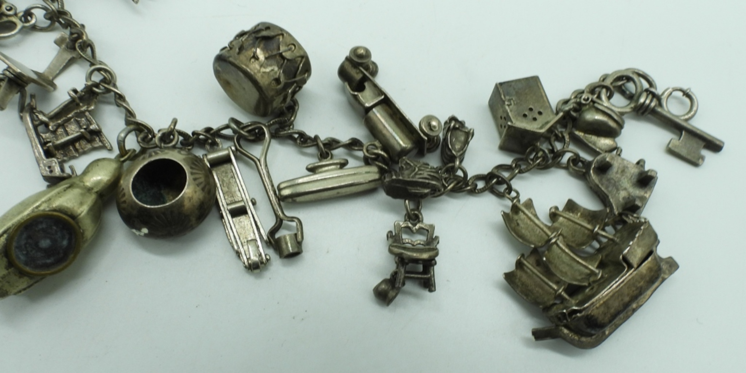 Vintage sterling charm bracelet with 19 charms, 7″ long. (28.8 dwt) (6x4x2)