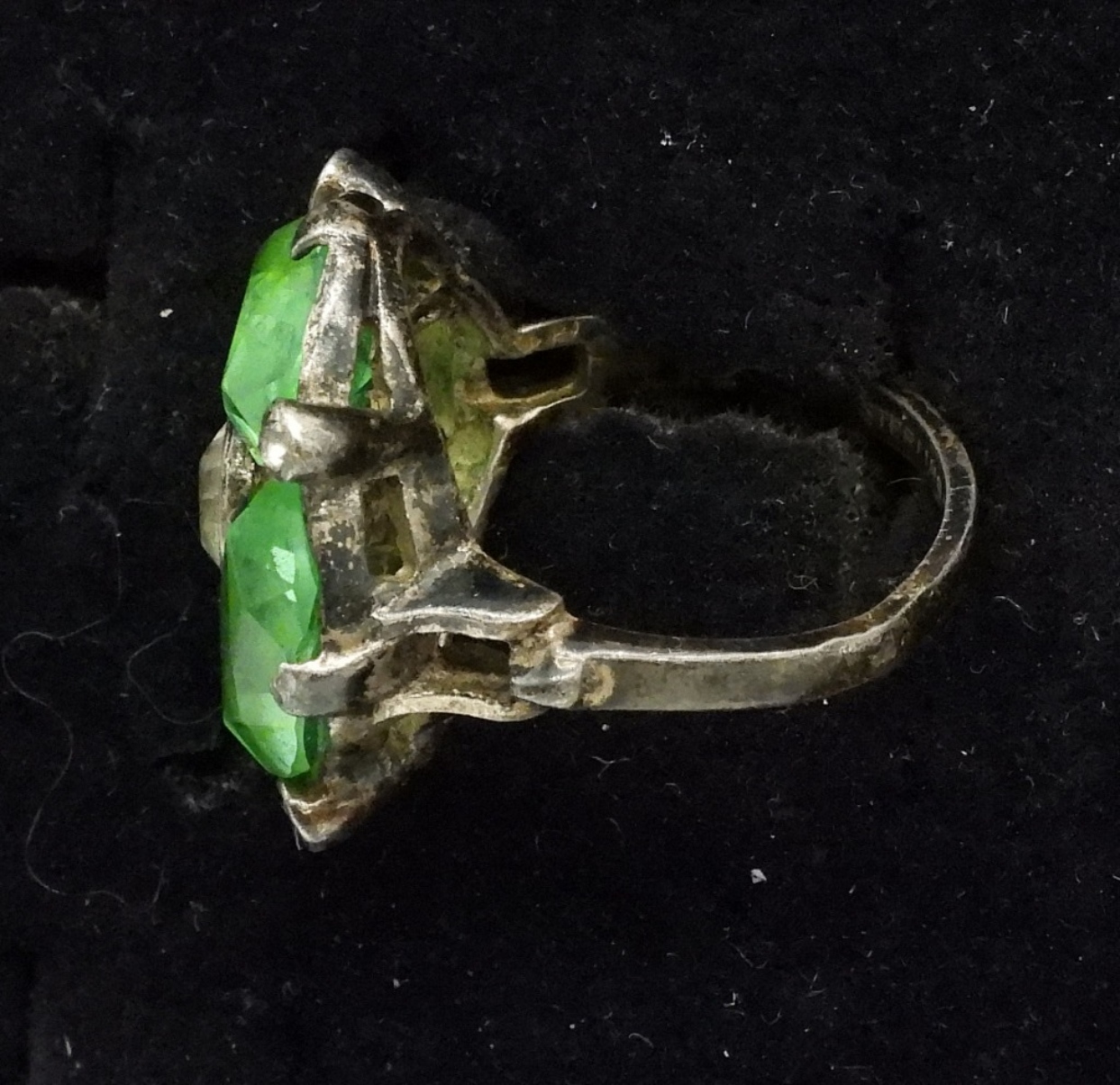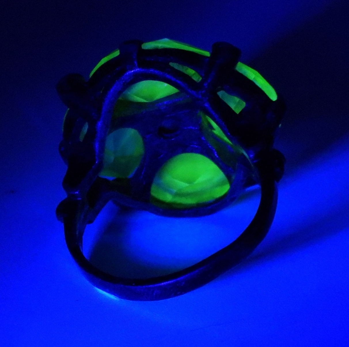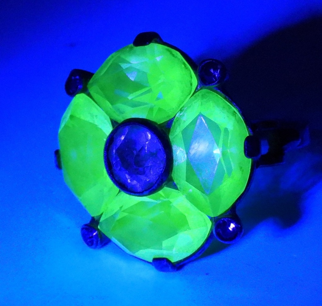 Size 7 sterling ring with four uranium glass gemstones and one clear center stone. (5 dwt) (6x4x2)