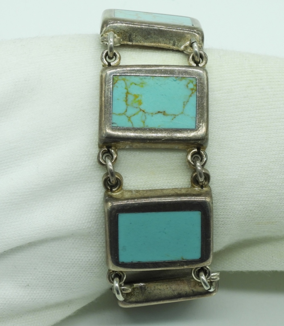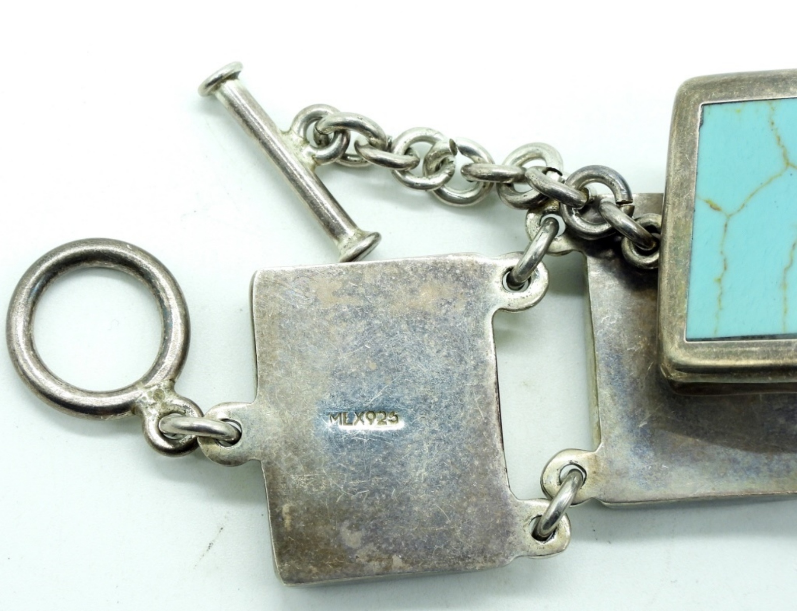 Mexico Sterling Turquoise Bracelet with Toggle Clasp. 7.5″ long. (34 dwt) (6x4x2)