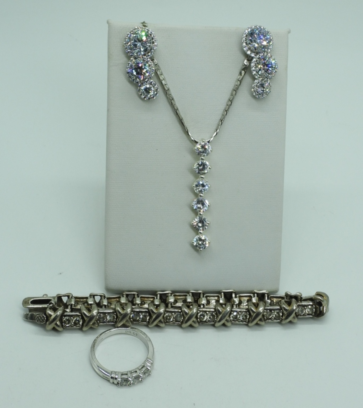 Bridal Style, simulated diamond sterling set. Necklace is 24″ long with 1.5″ long pendant. Bracelet is 7″ long. Ring size 6 and pierced earrings. (26 dwt) (6x4x2)