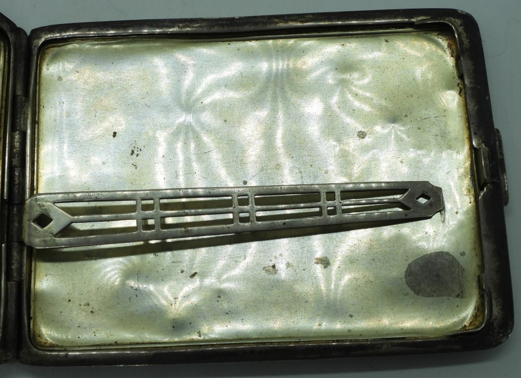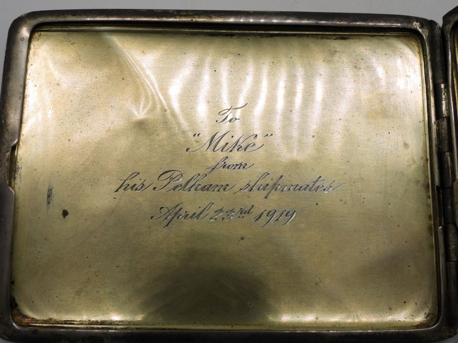 Vintage 1919 sterling wallet. Outside engraved “MC”. Inside engraved with “To Mike from his Pelham shipmates, April 23rd 1919”. 4.5″ wide & 3.5″ long. Very nice antique piece! Very Heavy! (88.7 dwt)