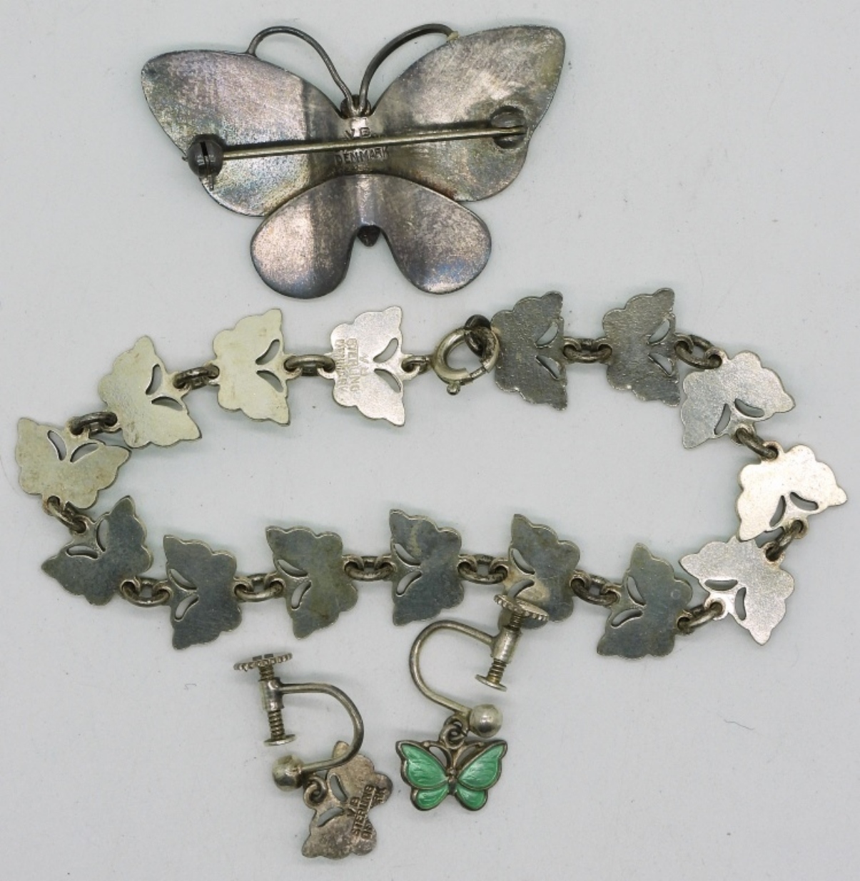 Denmark Vintage sterling, green enamel butterfly set. Brooch is 1 3/4″ wide, 1″ tall. Bracelet is 7″ long. Screw back earrings. (14.8 dwt) (6x4x2)