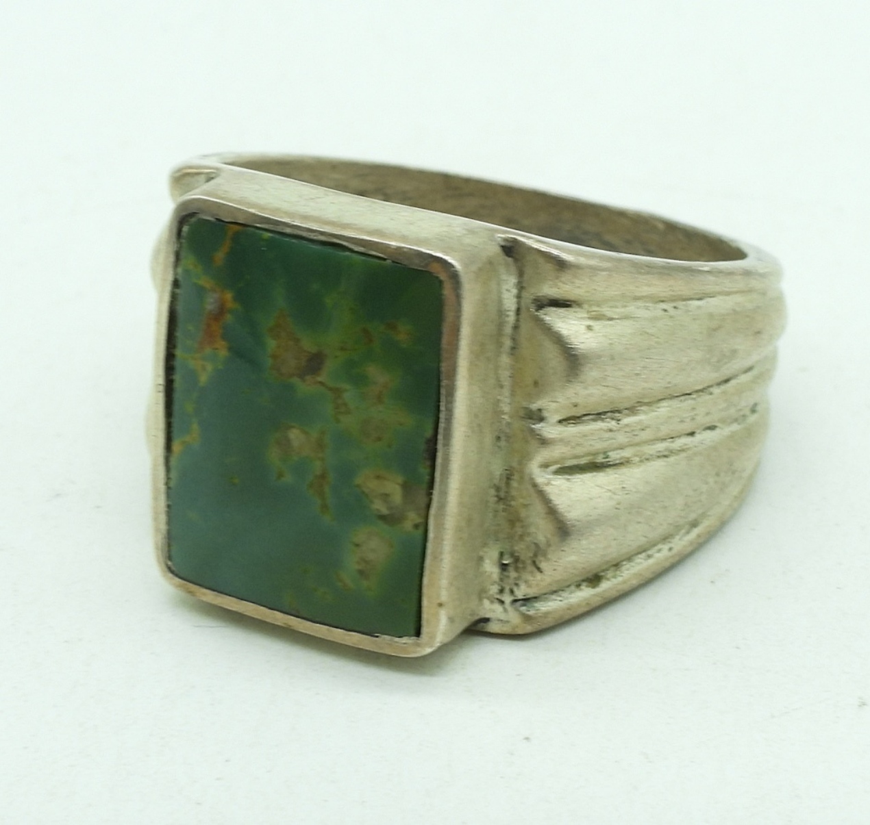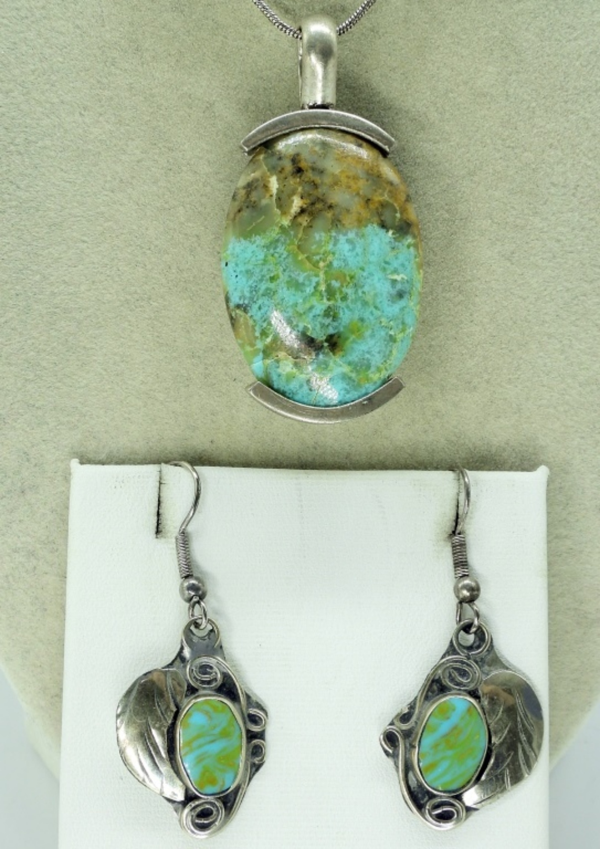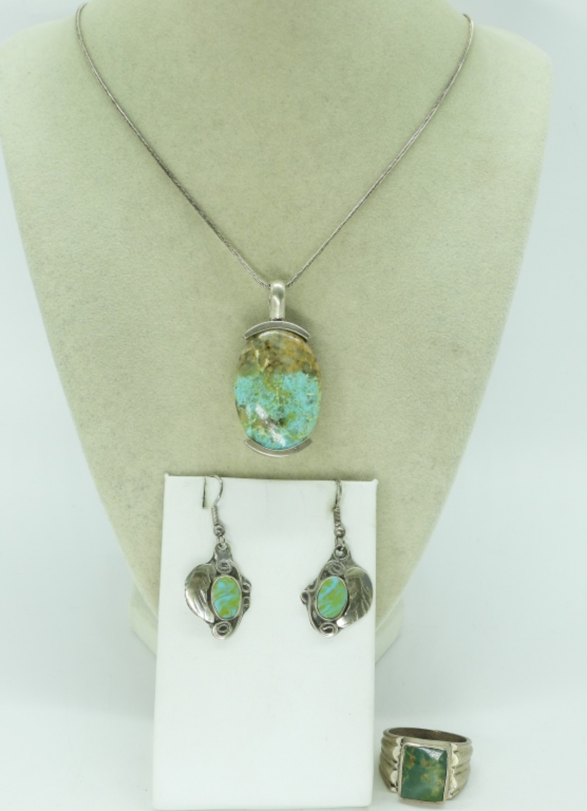 Vintage sterling turquoise pieces. Pendant is 2″ long, Chain is 30″ long. Ring is size 12. One pair of pierced earrings, 2″ long. (20.7 dwt) (6x4x2)