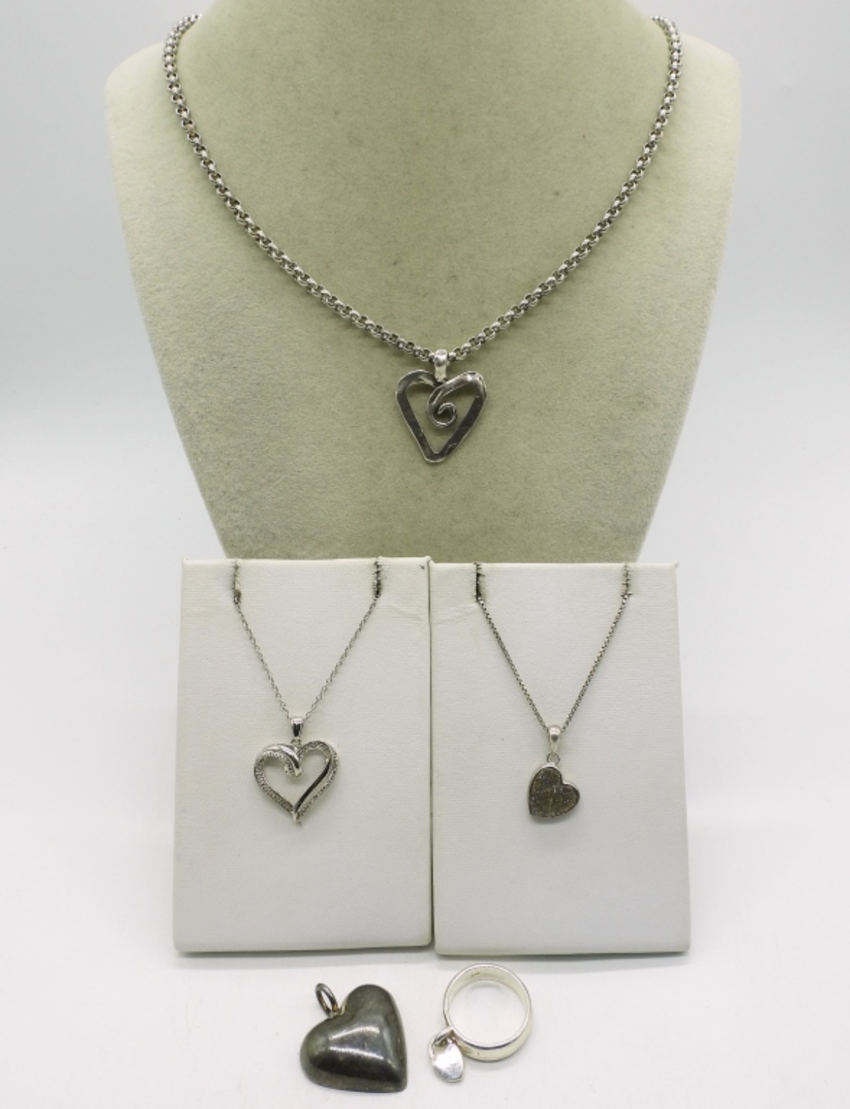 Three sterling heart pendant necklaces, 18-20″ chains. One loose heart pendant and a ring, size 6. (24.3 dwt) (6x4x2)