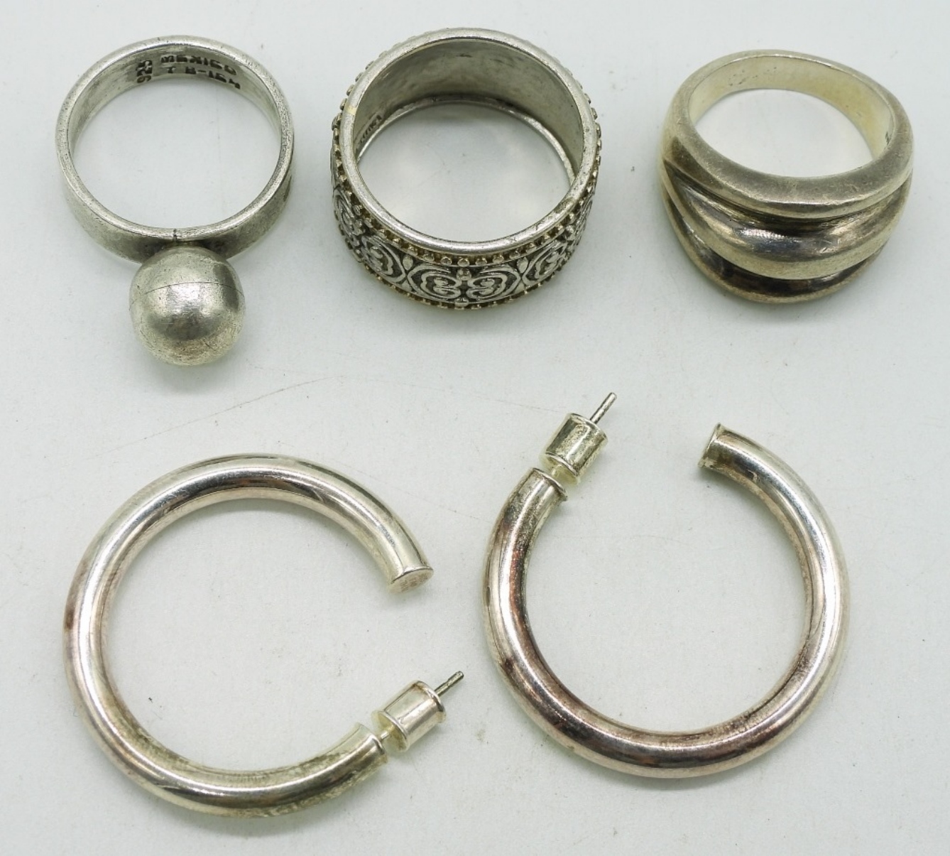 Taxco “TB-164” ring with ball topper, size 8. Two other sterling rings, sizes 7 & 9. Pierced sterling hoop earrings. (20.3 dwt) (6x4x2)