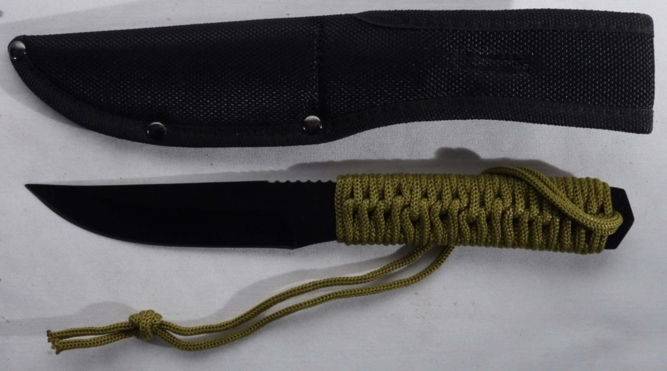 The handle is wrapped in green paracord and a black nylon sheath.