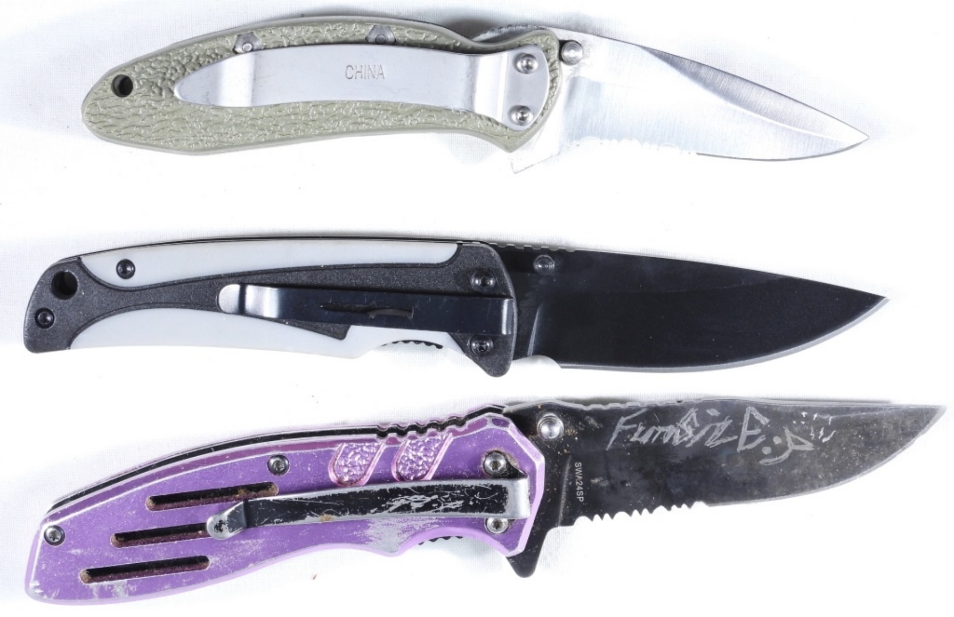1) Pink Smith & Wesson Extremes. 2) Camillus Titanium. 3) Does not have a name on it.