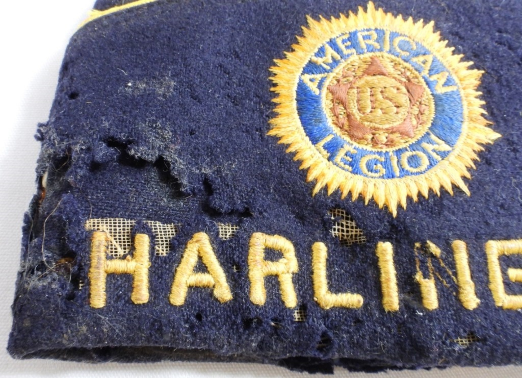 Very old and has holes. Harlingen, Tex 205. With 4 patches and 19 pins from 1948 to 1964